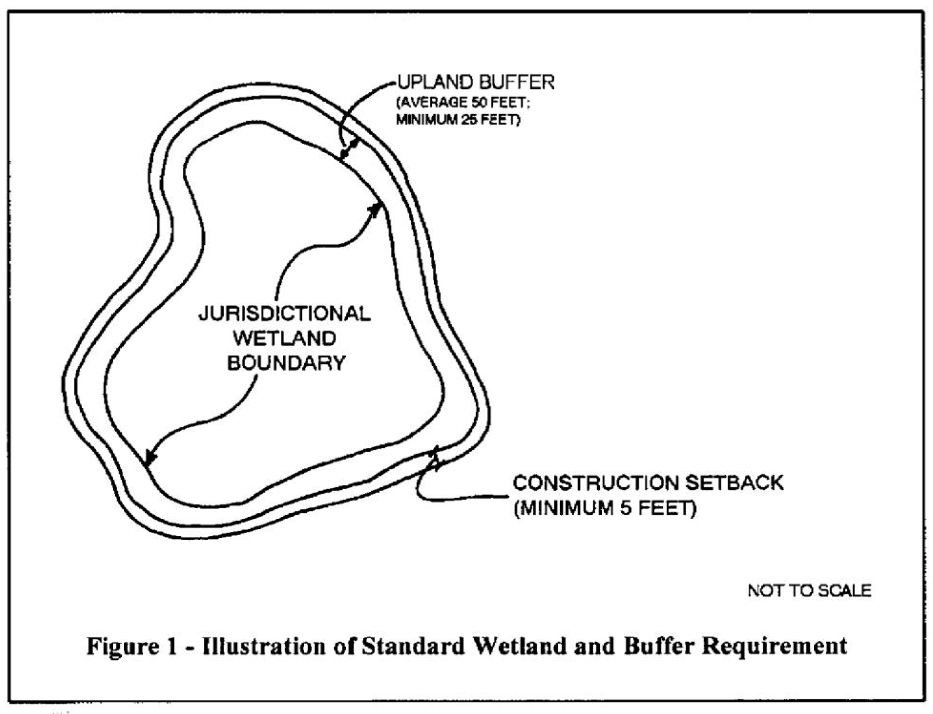 Wetland verification for the purposes of protection under this chapter shall be consistent with F.S. § 373.421, and with F.A.C. ch. 62-340. A wetland, with the required upland buffer and construction setback area, is depicted above as a "jurisdictional wetland boundary" in Figure 1. Surrounding the wetland is the required "upland buffer" and the "construction setback."
