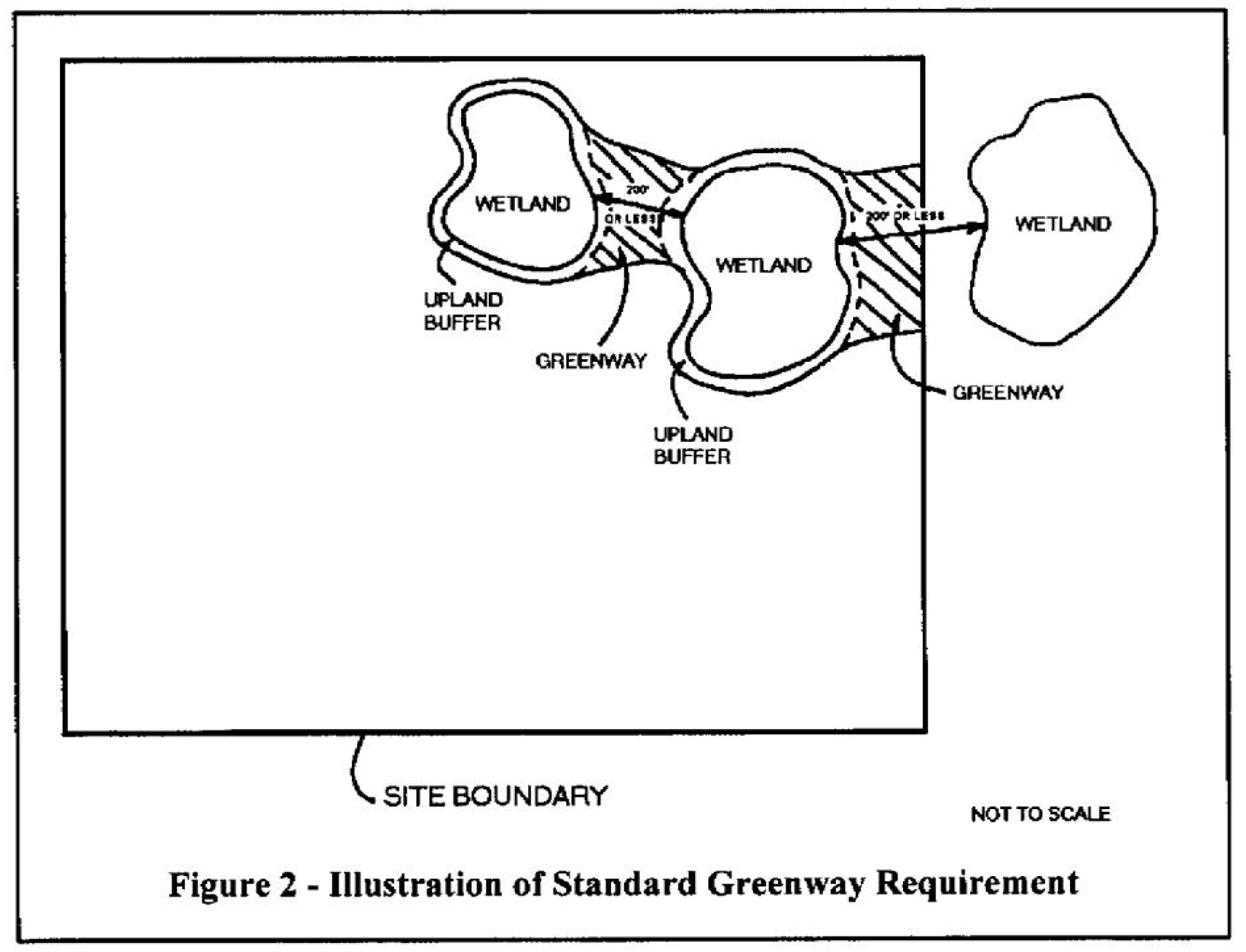The location of greenways between wetlands both on the development site and on property adjacent to the development site is illustrated in Figure 2 below.