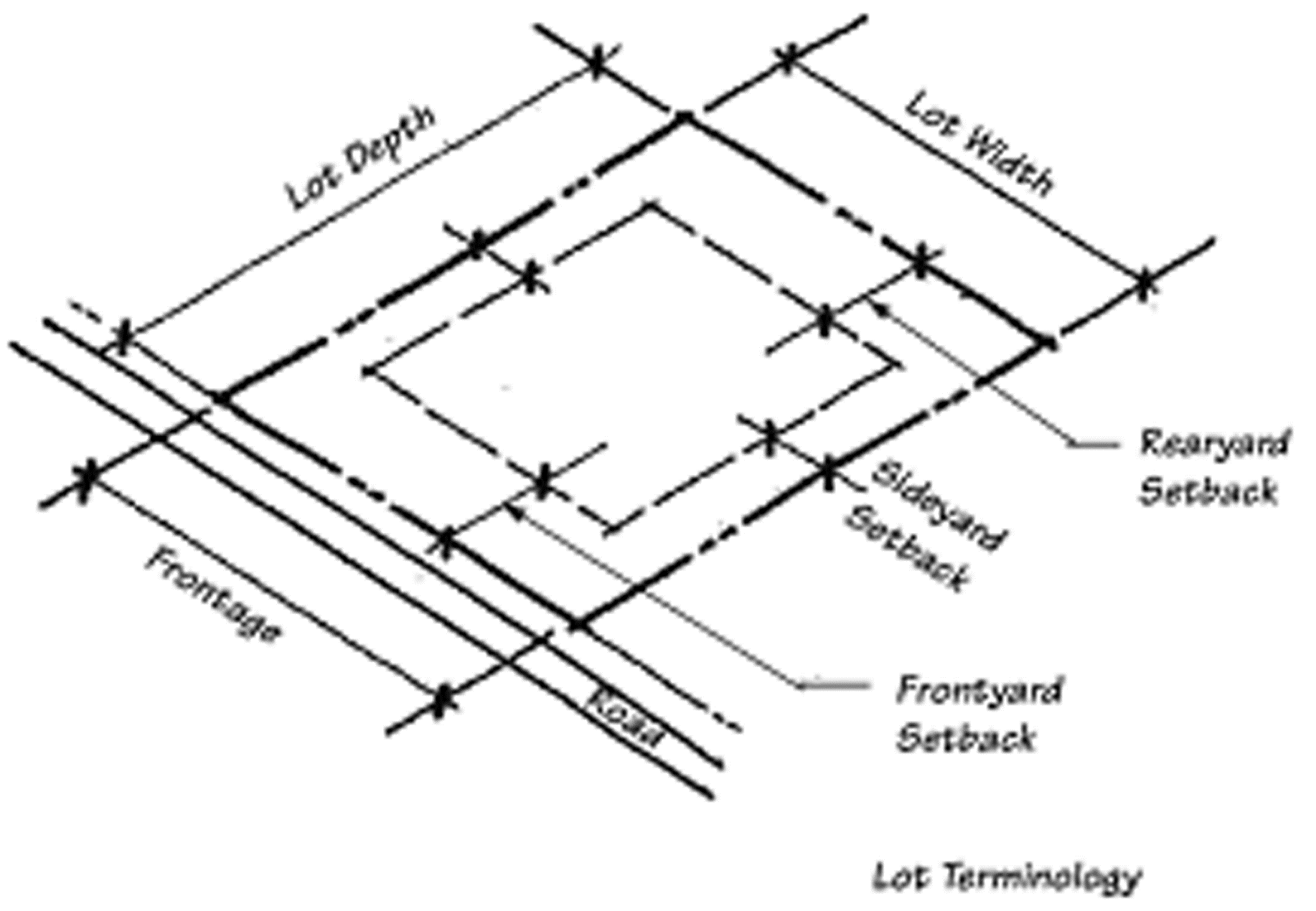 MEASUREMENT OF FRONT YARD SETBACKS AND ATTACHED GARAGE PLACEMENT. Setbacks are measured as the unobstructed, unoccupied open area between the furthermost projection of a structure and the property line of the lot on which the structure is located, except as modified by the standards of this Section. Setbacks shall be unobstructed from the ground to the sky except as specified in this Section. Structures shall meet the front yard setback from all abutting streets (excluding alleys) unless otherwise provided in this Ordinance.