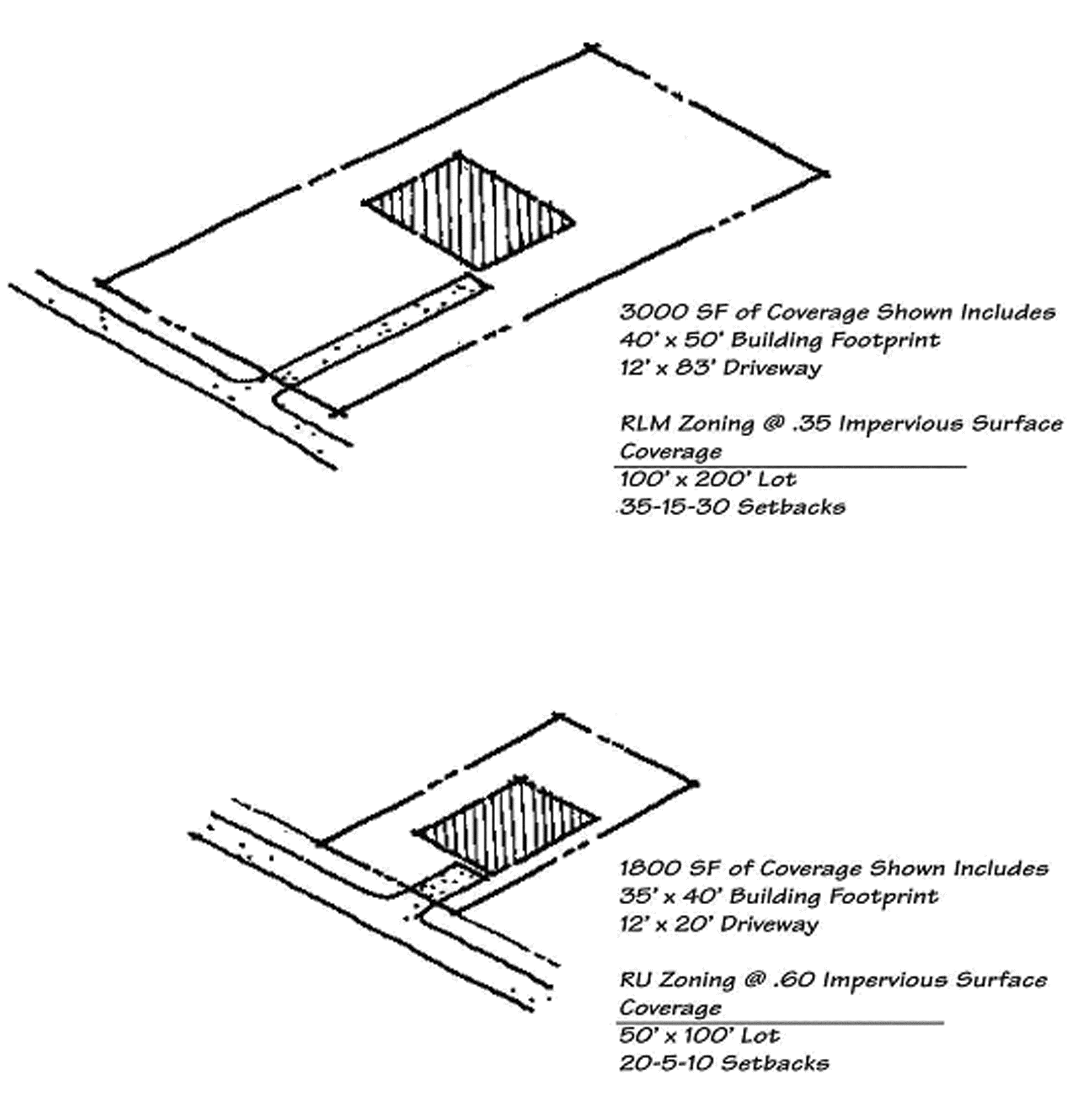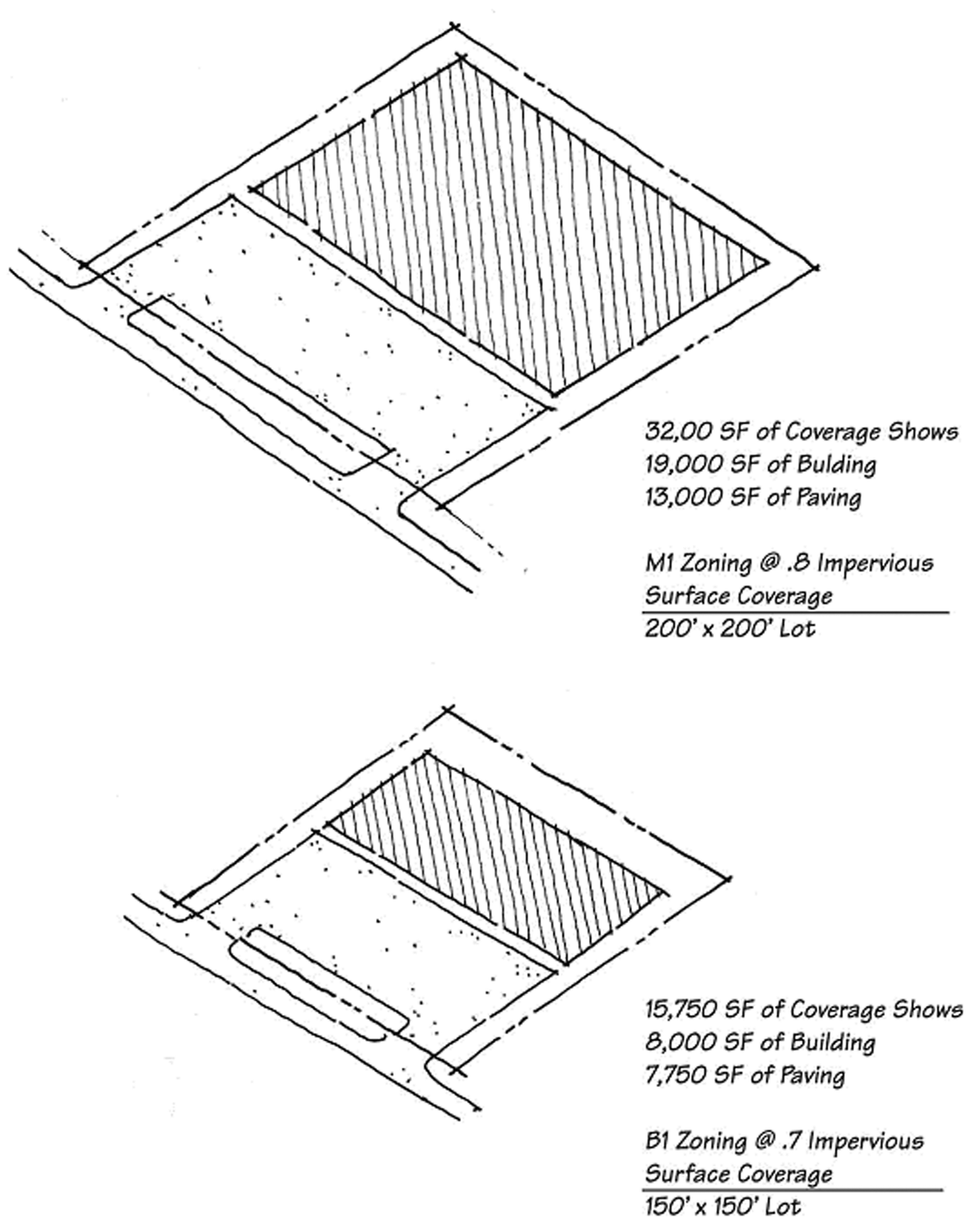 The floor area ratio and impervious surface ratio (columns (D) and (E)) are maximums and are expressed as a ratio (See Appendix A for definitions). Additional impervious surface restrictions might apply to portions of a site located within the Chesapeake Bay Preservation Overlay District, Section 31-415.