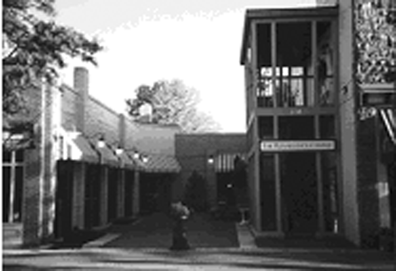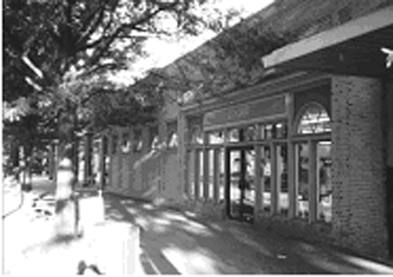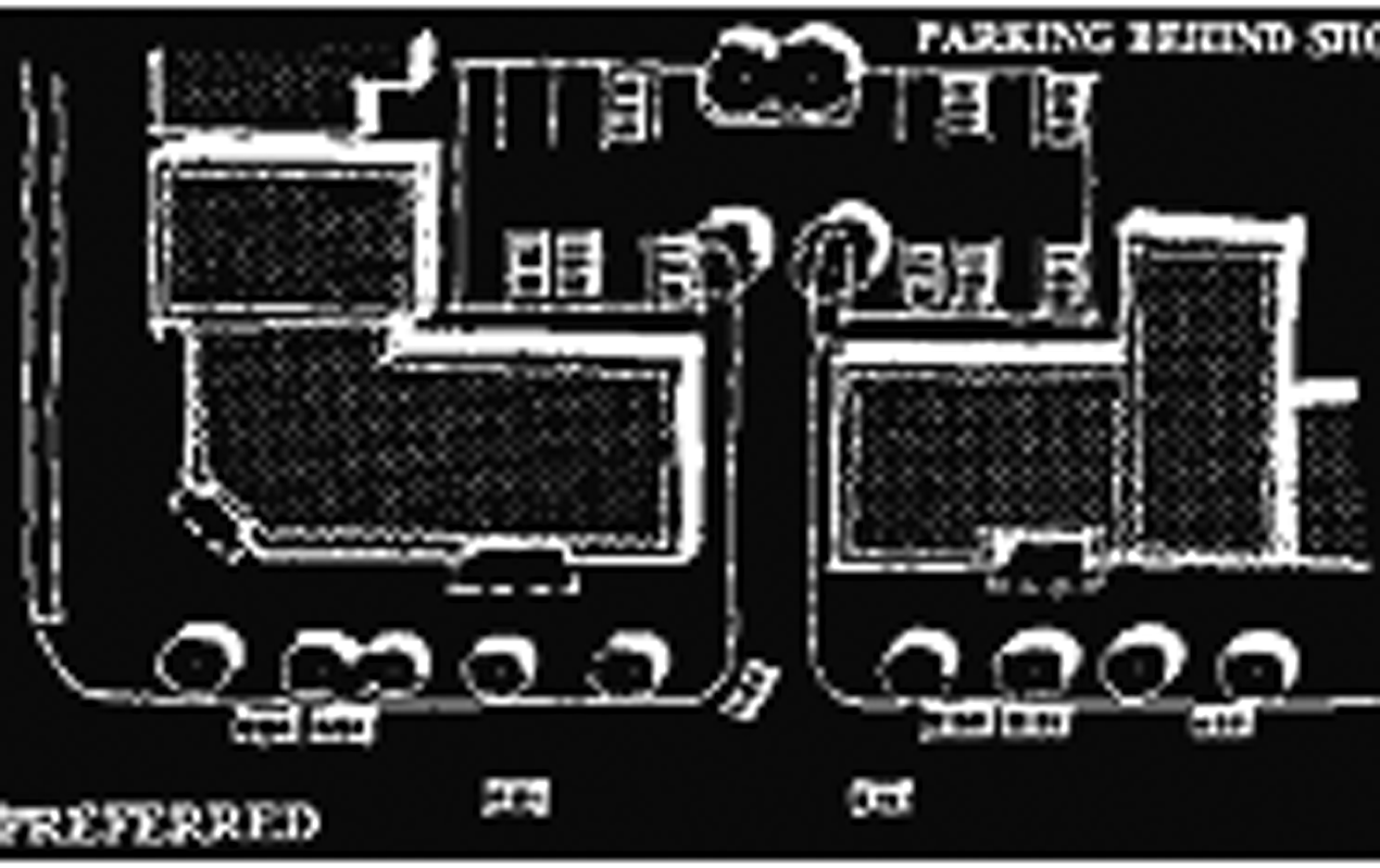 The interior of a block along an arterial or collector street which lies parallel to an existing town center;