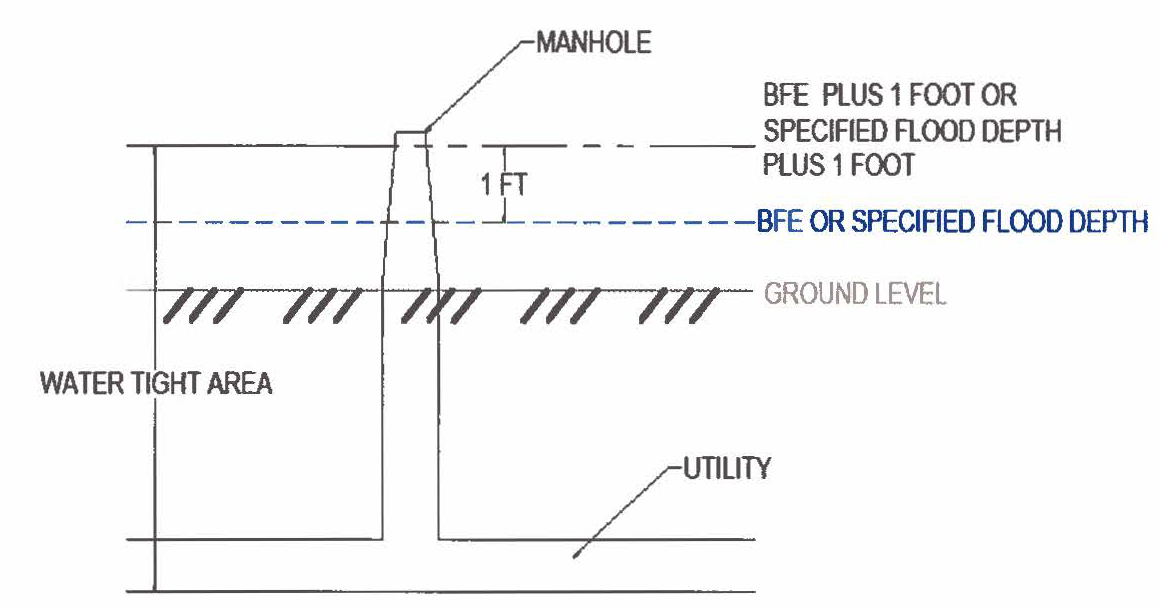 Together with attendant utility and sanitary facilities or any structure that is 1 foot above and below the BFE must be designed and constructed so that they are watertight with walls substantially impermeable to the passage of water and with structural components having the capability of resisting hydrostatic and hydrodynamic loads including the effects of buoyancy from at least 1 foot above the BFE to the depth of the facility (see Figure 1) in an AH Zone. The same requirement applies in an AO Zone, with at least 1 foot above the specified flood depth to the depth of the facility (see Figure 1).