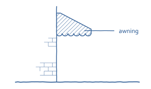 Awning: An overhang made of cloth or similar materials attached to a structure for decoration or protection from sunlight and precipitation. See Figure 20 1.