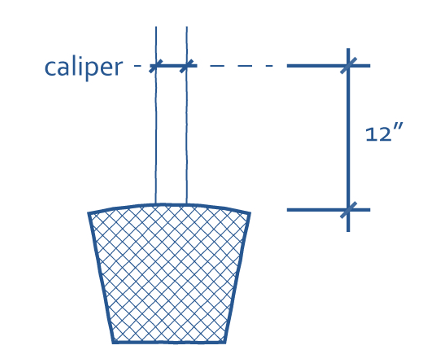 Caliper: A measurement of the size of a young tree, measured as the diameter of its trunk 12 inches above the root ball. See Figure 20-4.