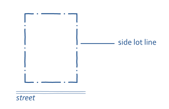 Yard, Side: The yard that exists between a building and the interior side property line of the lot on which the building is located, extending along a side property line.
