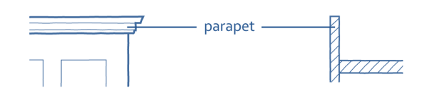 Eave: The lower edge of a sloping roof surface or the top edge of a parapet or flat roof. See Figure 20-7.
