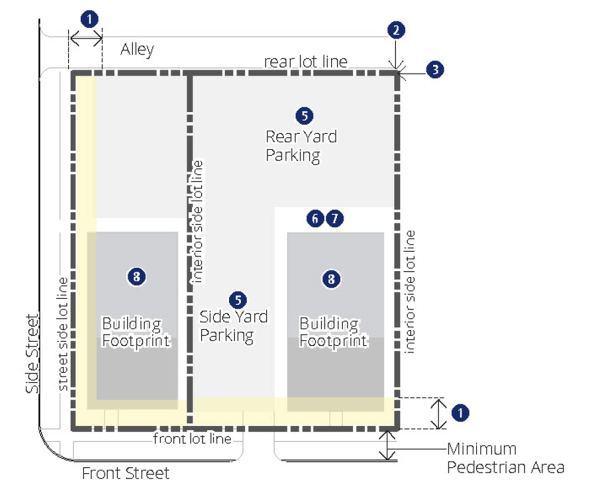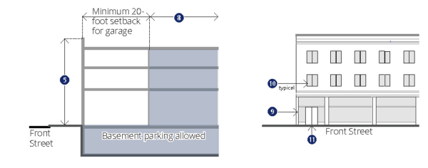 | i | Parking within Building | If above-grade, parking must be set back at least 20 feet from front facade; no setback required if below grade | ||