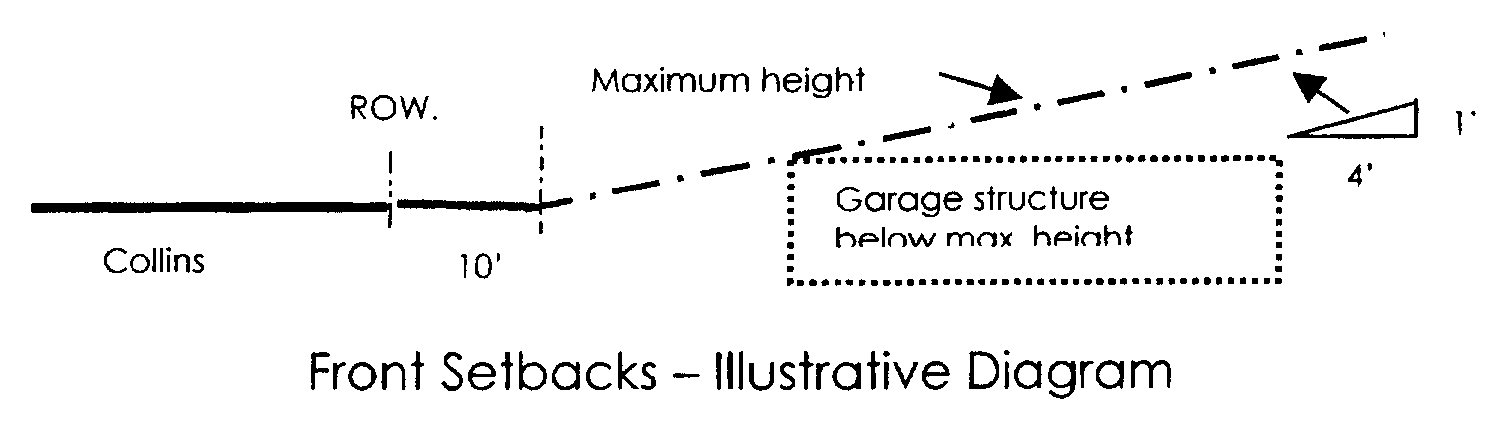 The minimum front setback shall be 75 feet, provided that a porte-cochere and/or guardhouse shall be permitted to be setback not less than 50 feet. If a new structure is part of an existing development, which will remain, the front setback may be equal to the setback of the existing structure provided that the minimum setback of a porte-cochere and/or guardhouse shall be no less than 50 feet. Parking structures may encroach on the front setback area not closer than ten feet to the Collins Avenue right-of-way provided that no portion of the garage structure shall extend above a slope beginning at the elevation of the public sidewalk and rising east from the ten-foot setback line one foot vertically for each four feet horizontally.