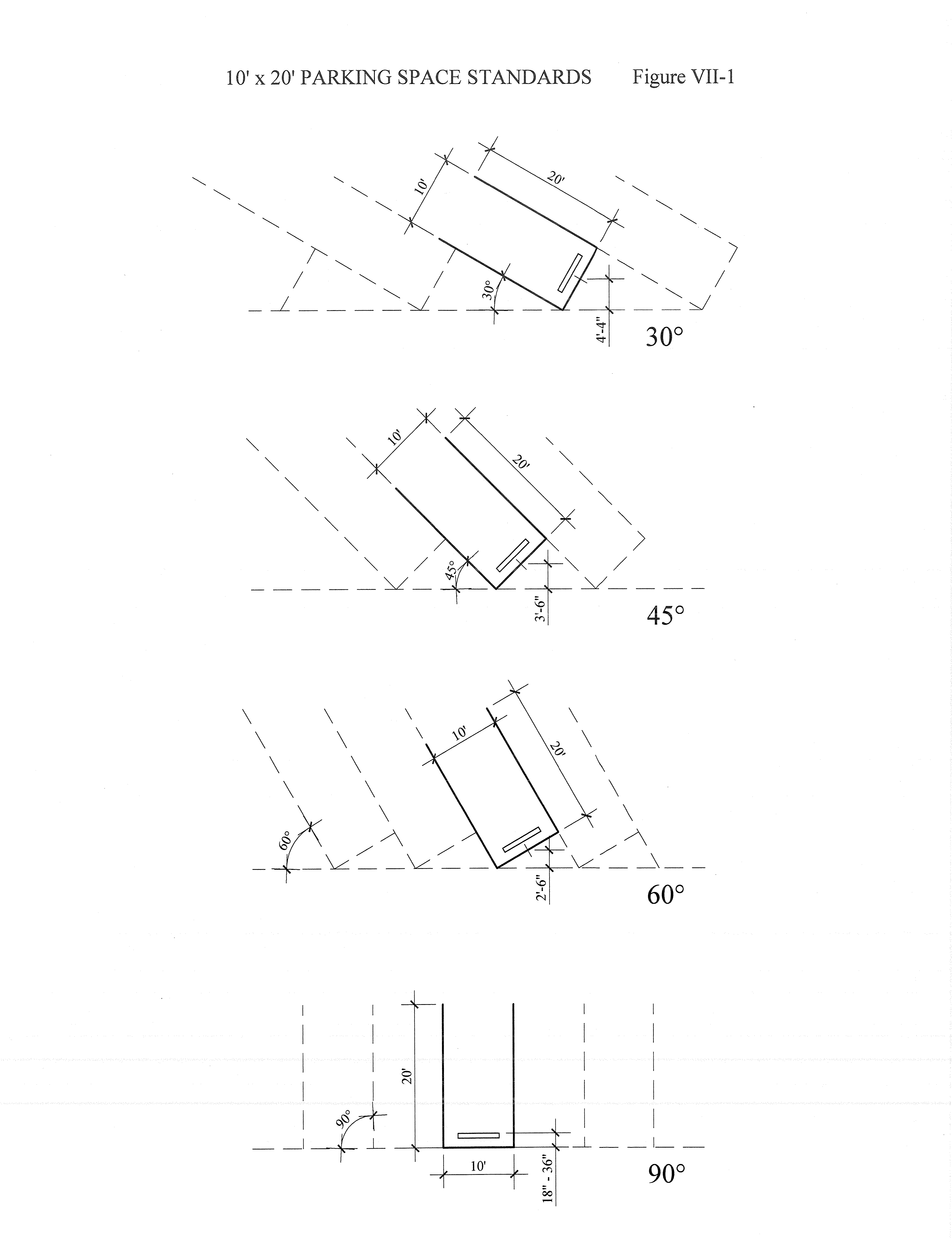 Nine (9) feet in width and eighteen (18) feet in length, angled at ninety (90) degrees only, as defined in Figure VII-1, are permitted for: