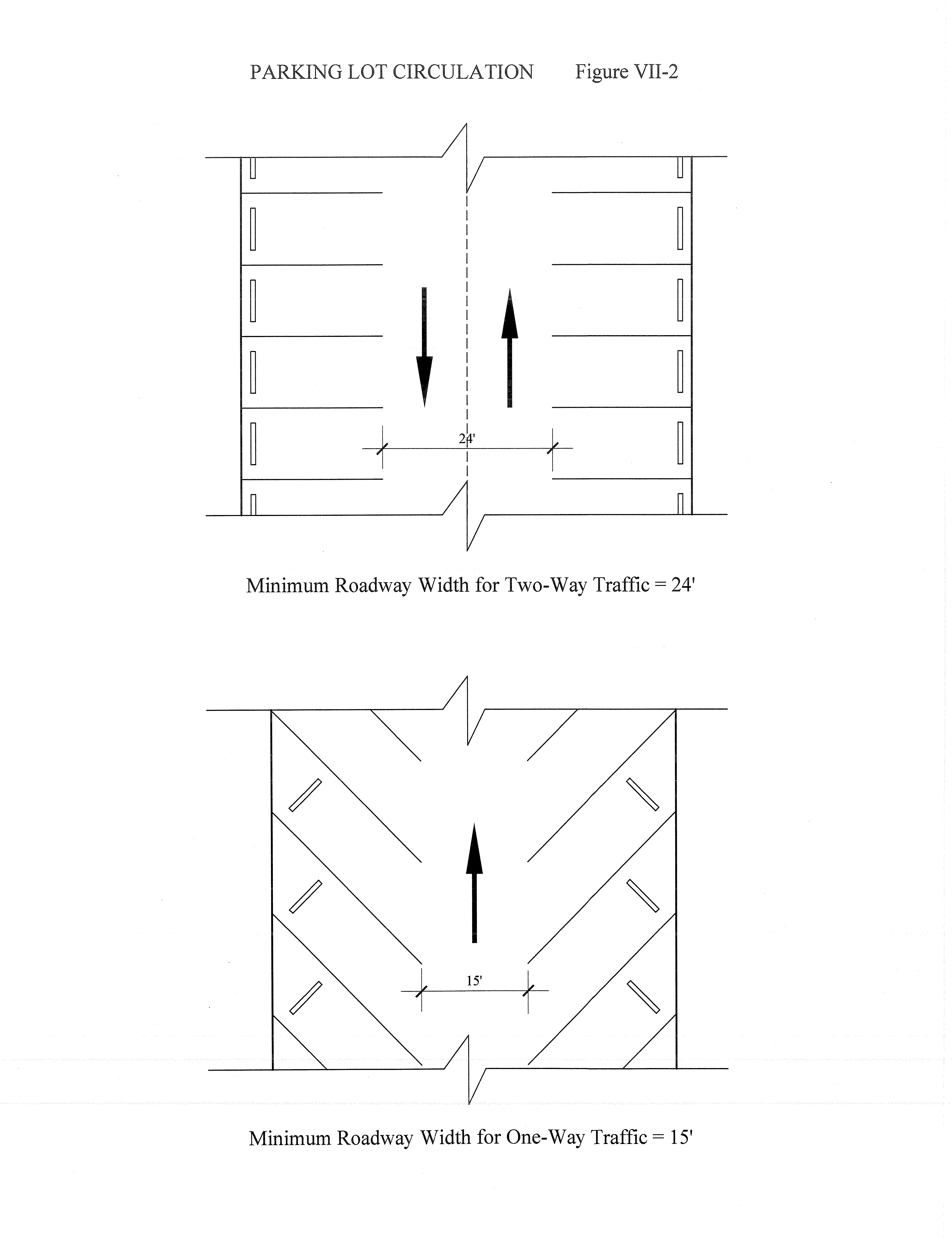Access: Each parking space shall be accessible from a street or alley or from an adequate aisle or driveway leading to a street or alley. The width and design of the drive aisle shall conform to Figure VII-2. In no instance shall vehicles be allowed to back into a public right-of-way or otherwise enter or leave the parking area, except at approved entrance and exit points, except that a single-family home may provide a driveway that directly exits onto a platted public right-of-way of sixty (60) feet or less.