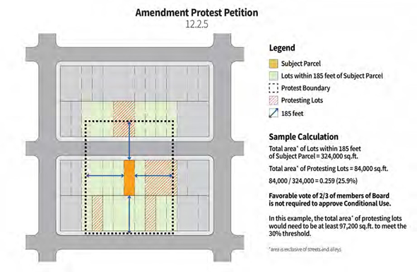 Protest. In case of a protest petition against any proposed amendment signed and acknowledged by the owners of thirty percent or more, either of the areas of the land (exclusive of streets and alleys) included in such proposed change or within an area determined by lines drawn parallel to and one hundred eighty-five feet distant from the boundaries of the district proposed to be changed, such amendment shall not become effective except by the favorable vote of two-thirds of all the members of the Board of Aldermen. The thirty (30) percent threshold required for a protest under this Section is determined by computing a ratio of the total area contained in the protesting lots divided by the area contained in all lots within the 185-foot radius of the subject parcel.
