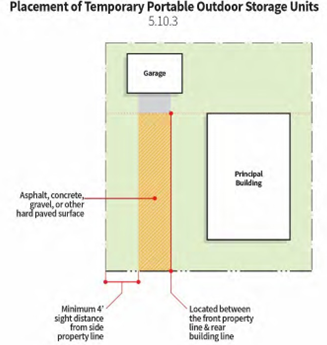 Placement. The temporary portable outdoor storage unit cannot encroach on City property, City right-of-way, neighboring property, sidewalk, or be placed in the street. The unit must be sited on asphalt, concrete, gravel, or hard paved surface between the front property line and the rear building line of the principal structure. The visual distance between the portable temporary storage unit and the side yard property line is four feet (4') or upon the approval by the Public Works Director or his/her designee and as agreed upon by written consent by the neighboring property owner.
