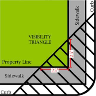 Perimeters adjacent to public right-of-way: A visual clearance area between the height of two and one-half (2½) feet and ten (10) feet shall be maintained on the corners of all property adjacent to the intersection of two (2) streets or a driveway providing access to a public or private street within twenty-five (25) feet of the intersections of the right-of-way of streets or of streets and driveways. (See diagram below.)