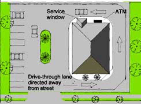 All order boxes, menu stands, pick-up windows, service/teller windows, and required vehicle queuing associated with drive-thru services shall be located to the side or rear of the buildings. For the purpose of this section, the side or rear shall mean the area behind a projected line running parallel from the front (street facing) side(s) of the structure to the side property line. This concept is depicted in the graphic below: