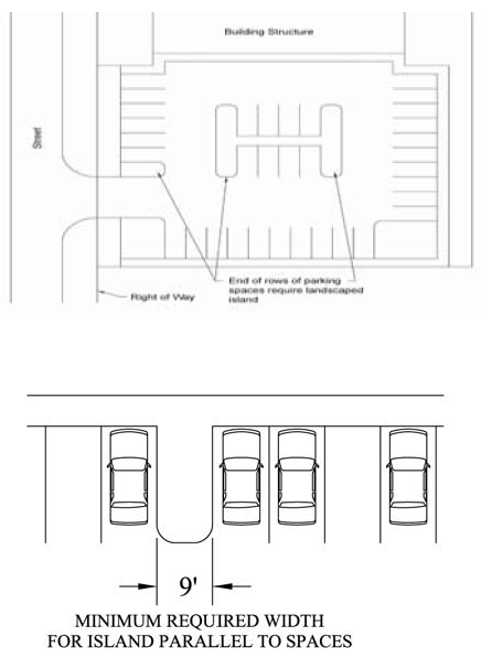 Interior parking buffer area requirements: Landscaping provided around the perimeter of the building and interior parking areas enhance the appearance and customer attraction of commercial businesses.