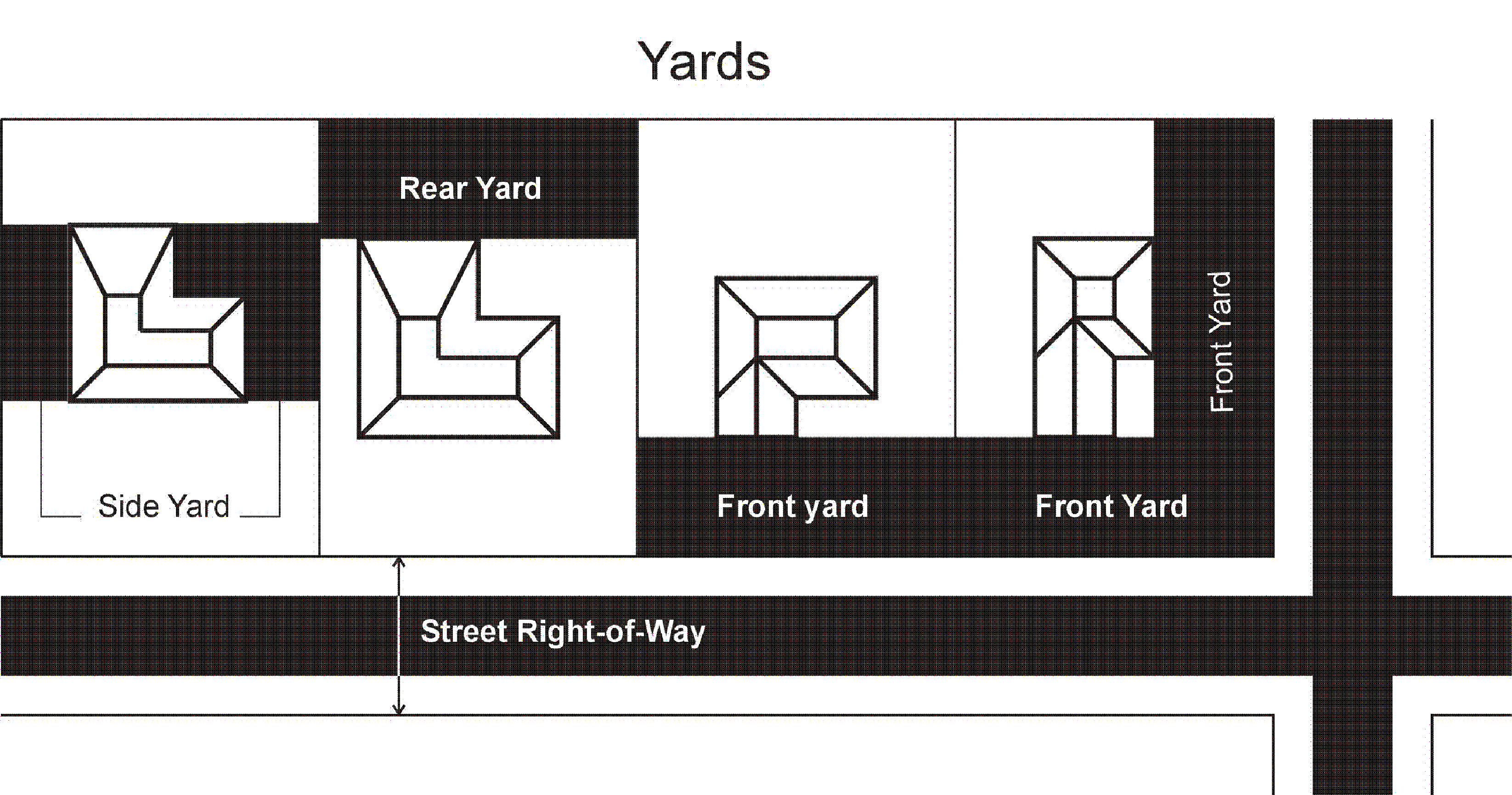 Yards: The open spaces on the same lot with a main building, unoccupied and unobstructed from the ground upward except as otherwise provided in this ordinance, and as defined herein: