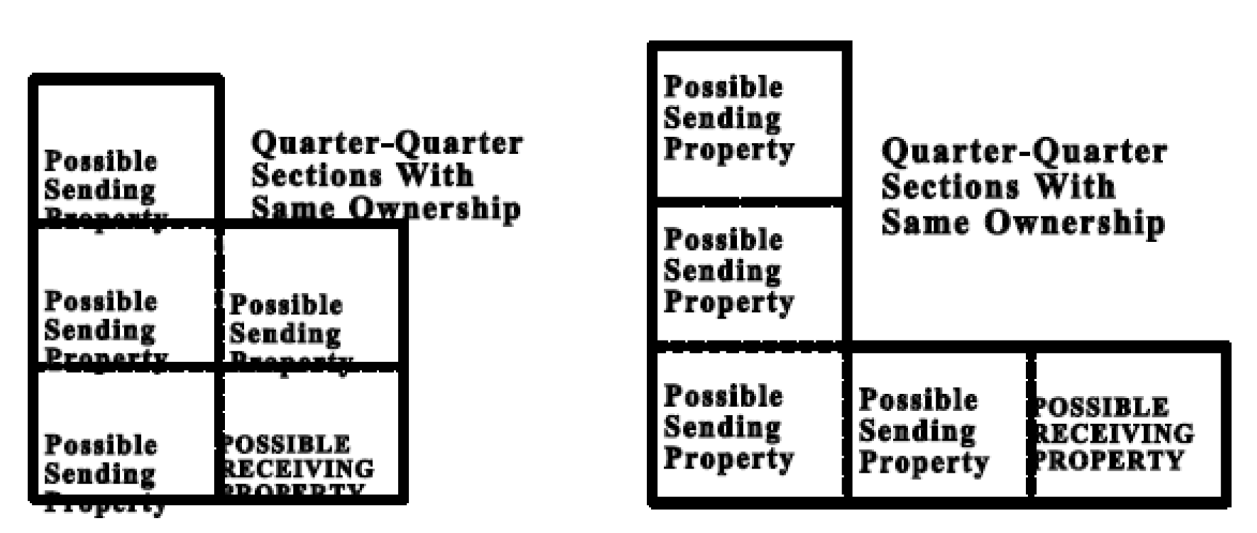 Development rights can be used to increase a permitted density on a contiguous quarter-quarter section or government lot (see Figure 1). As a result, each quarter-quarter section or government lot (receiving property has up to eight possible contiguous quarter-quarter sections or government lots (sending properties) for which the development right could be transferred (i.e., the contiguous north, northeast, east, southeast, south, southwest, west and northwest quarter-quarter sections).