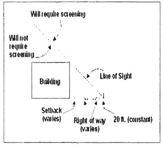 Requests to install roof mounted antennas shall be accompanied by a line of sight analysis for each building elevation. The line of sight analysis shall be as provided for in the sketches shown below as figures 5.02.06(a)(2)(D)i and ii. In conducting such analysis, the width of the right-of-way shall be equal to the width of the right-of-way fronting the particular elevation.
