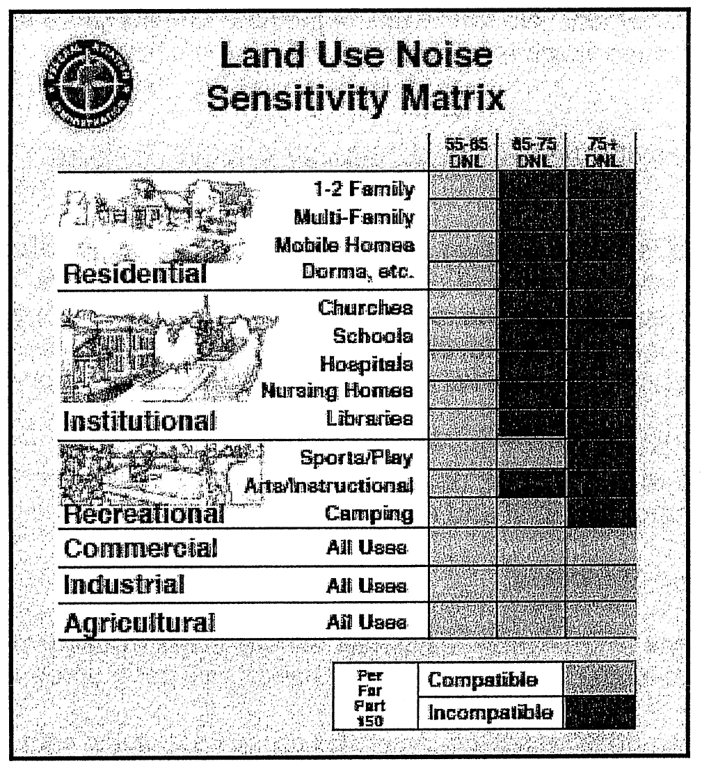 Noise sensitive uses, such as housing, schools, medical facilities or places of worship; uses that tend to concentrate large numbers of people (certain higher residential densities, schools, churches, hospitals, sports stadiums, shopping malls) are generally deemed incompatible, but may be allowed depending on the level of exposure to excessive noise and accident potential and contingent upon the use of noise level reduction measures in the construction of the building and/or site.