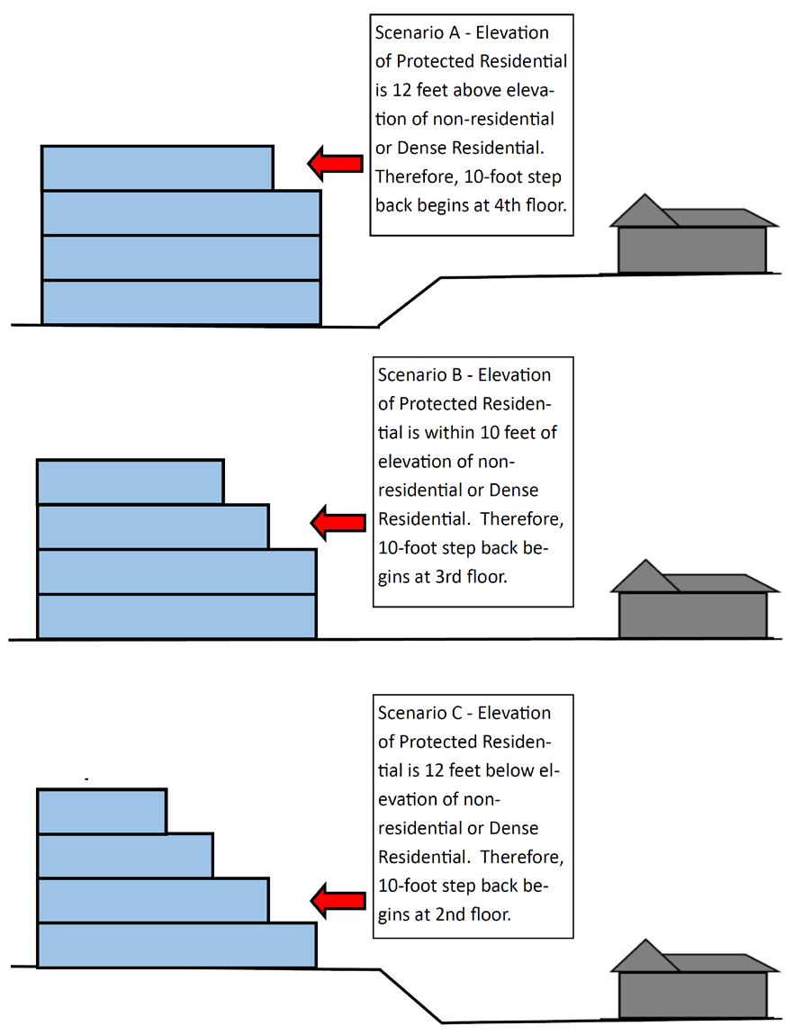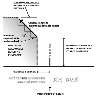 b. Properties adjoining Residential Preservation zoning districts shall apply Urban Buffer 2, above, and step back buildings at 3 stories in height. The stepback shall be a minimum of 15-feet wide and then follow a 45-degree angle to the maximum allowable building height.