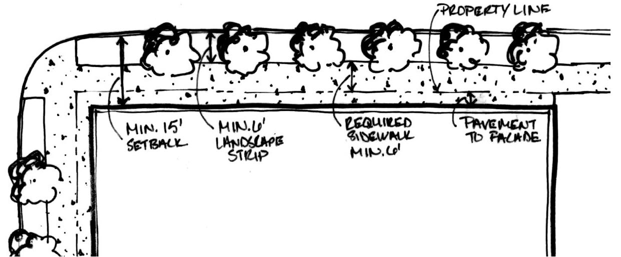 Double Frontage parcels shall apply those standards for Principal Frontage including but not limited to setbacks, transparency, landscaping and streetscaping, and sidewalks.