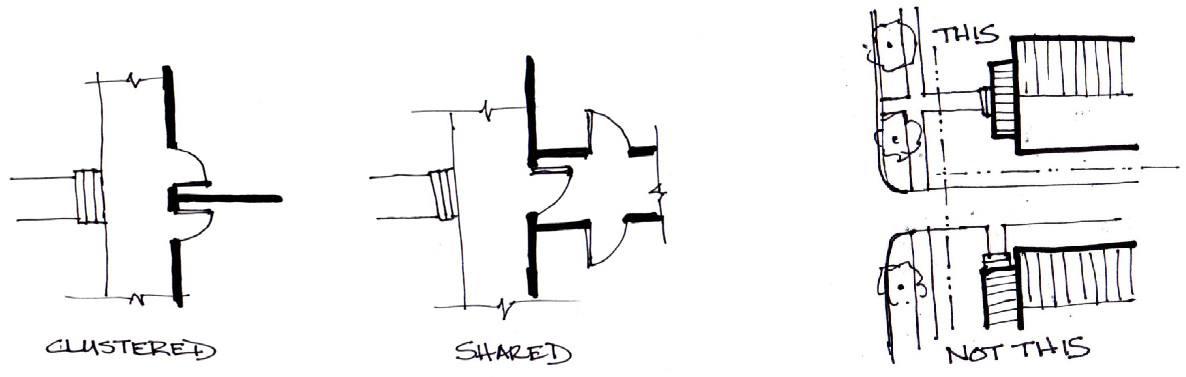 Staircases or elevators shall be located near exterior sidewalks to minimize pedestrian-vehicle conflicts.