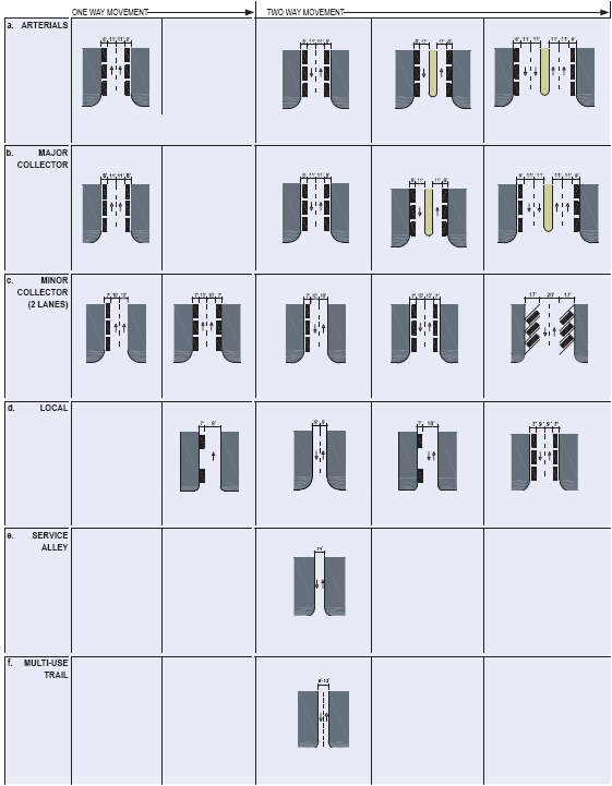 Table 2B: Vehicular lane/parking assemblies. The following street sections are desirable in the MMTD and new roadways shall adhere to these standards. Alternative assemblages will be considered to fit local context, and such alternatives should maintain consistency with the urban intent of Section 10-280.3. Proposed alternatives must be approved by the City.