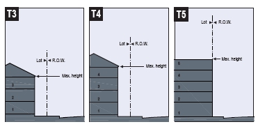 TABLE 6: Building Configuration. The table shows the configuration of different building heights for each Transect zone. Heights vary within the Downtown Overlay, and are controlled by the Sec. 10-282.1 Downtown Regulation Plan map series.