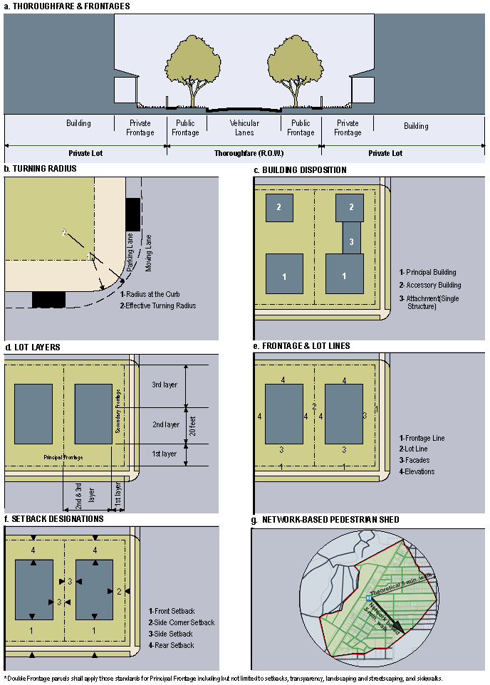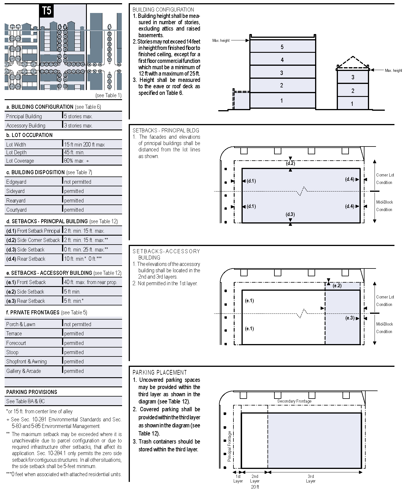 TABLE 5: Private frontages. The private frontage is the area between the building facade and the public right-of-way line. The following passages provide general descriptions of the frontage types and the specific transect in which each is permitted.