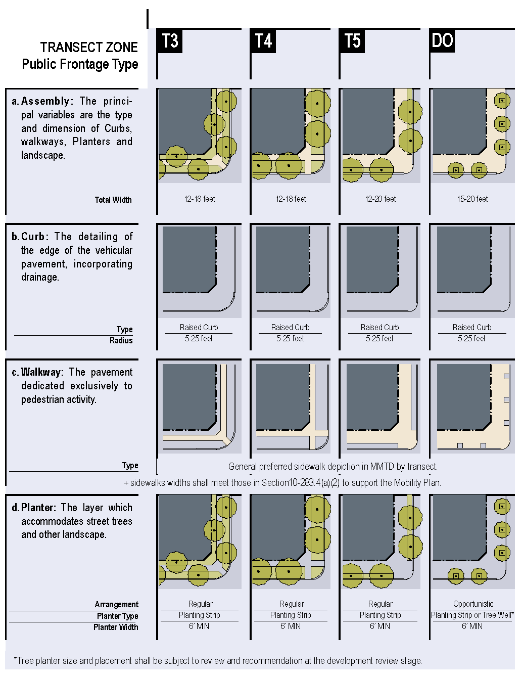 TABLE 3: Public Frontages — Specific: The table depicts requirements and dimensions for public frontage elements — curbs, walkways, and planting areas — relative to specific transect zones. Local context should be considered during design, and thus, the table sets a flexible range of requirements per transect.