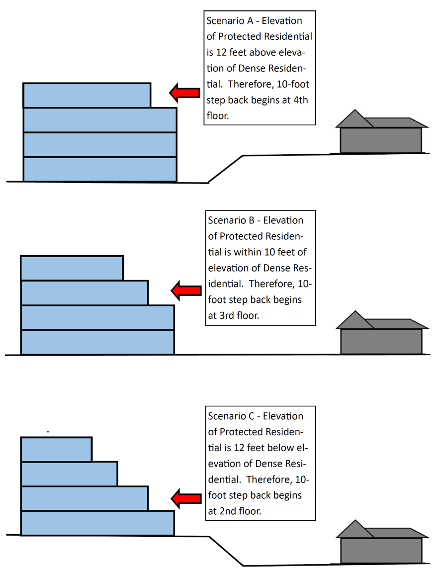 If any of the above location criteria are met, a height step back is required and shall vary based on the first floor elevation of the dense residential use in relation to the first floor elevation of the protected residential use as follows: