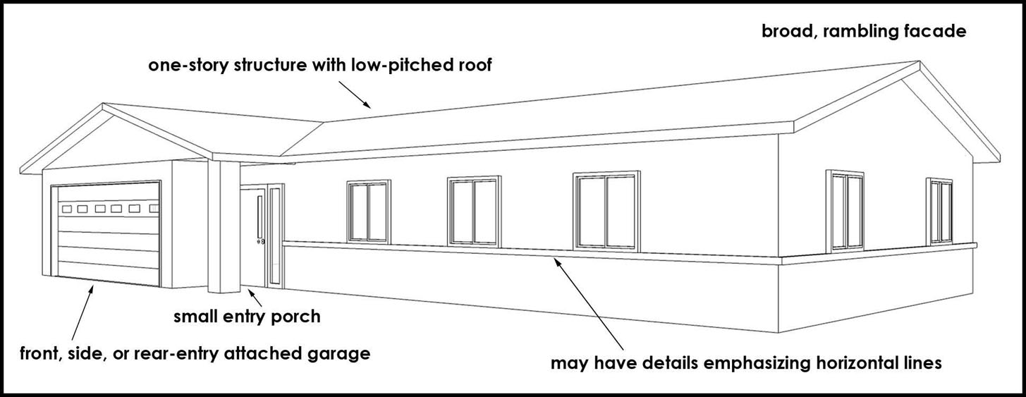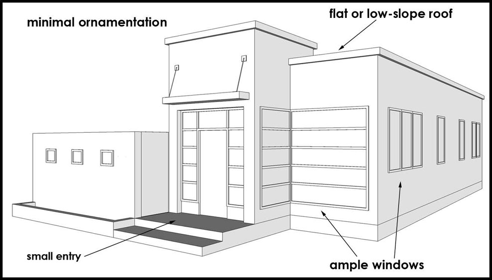 Characterized by ample windows and flat or low-sloped roofs (or a combination of the