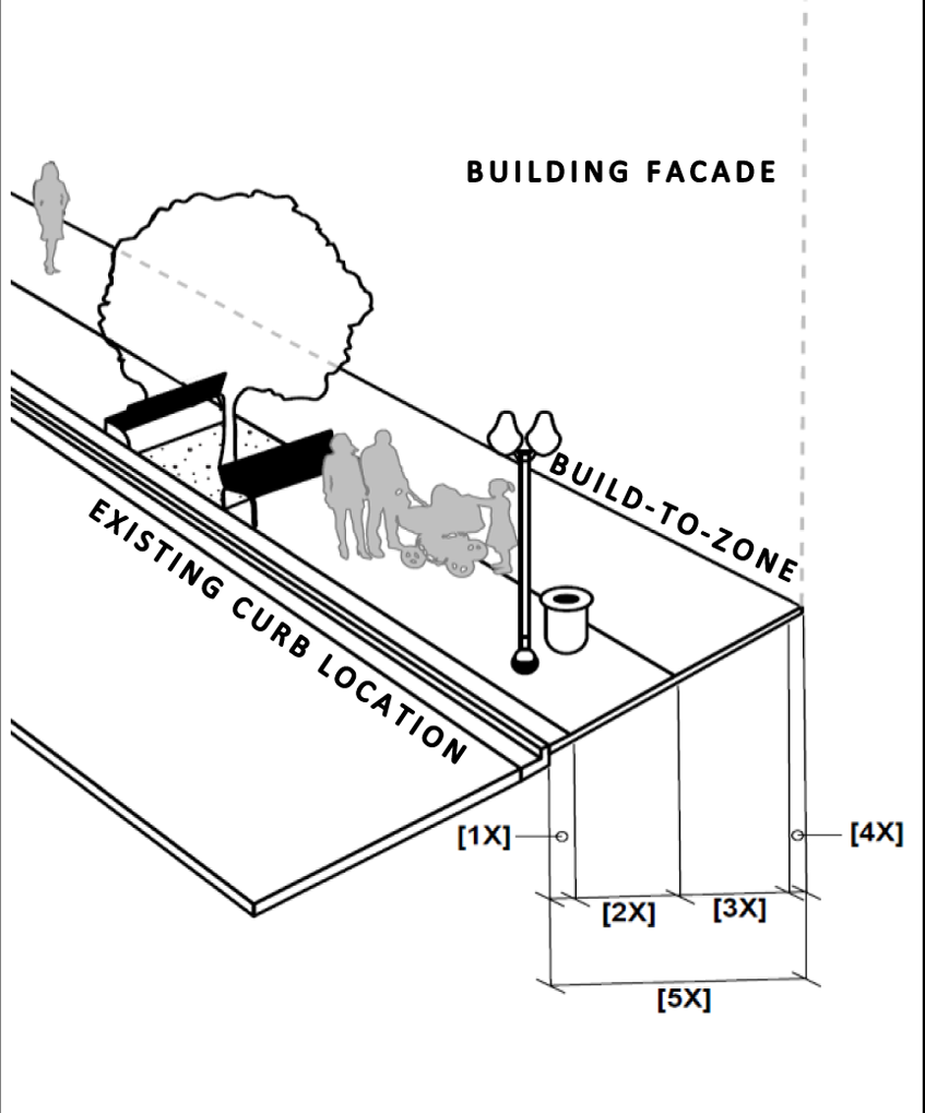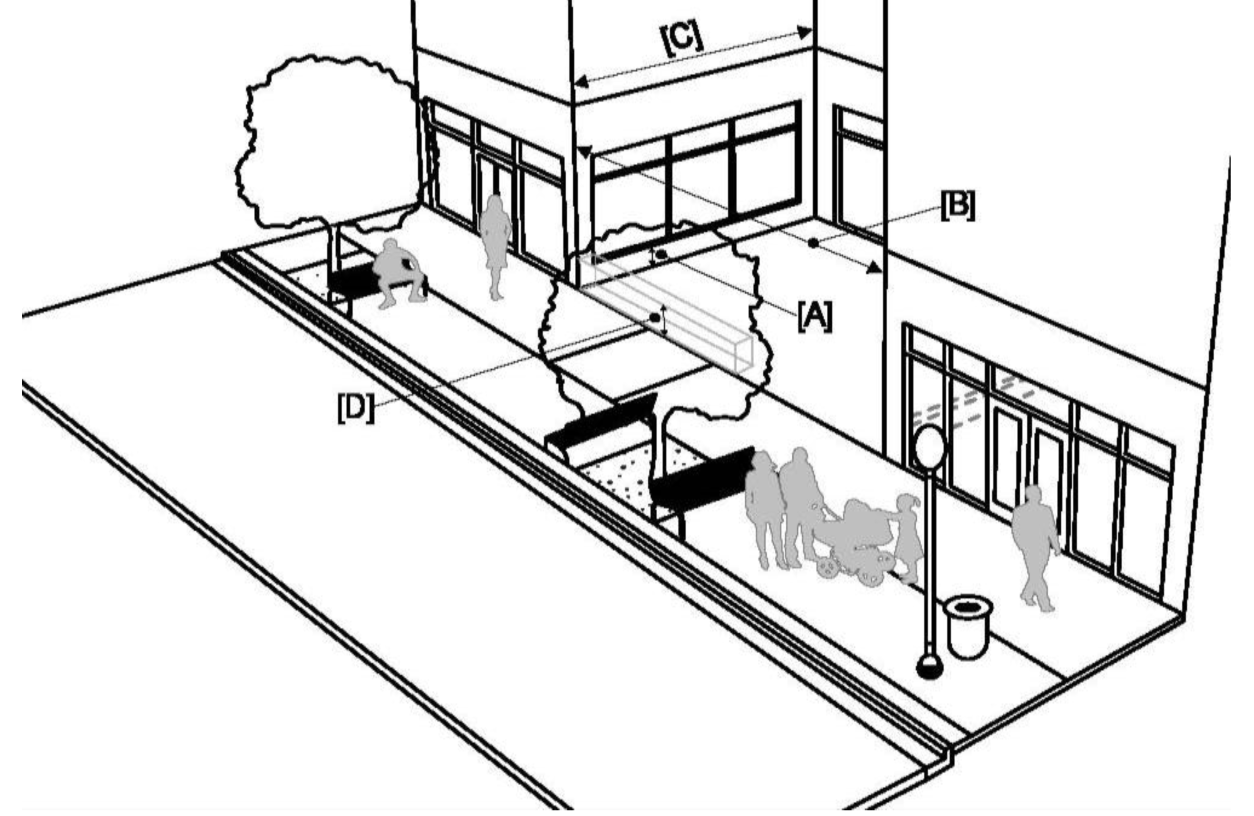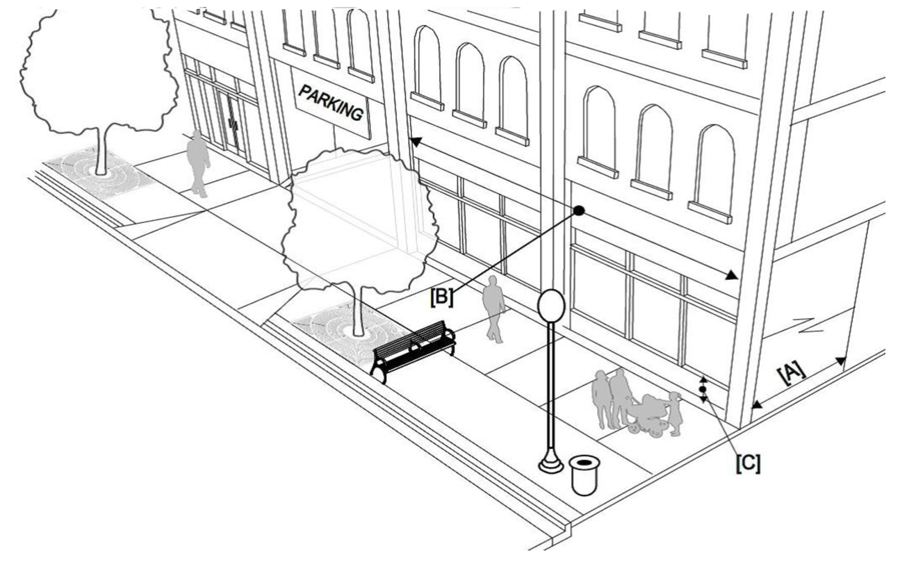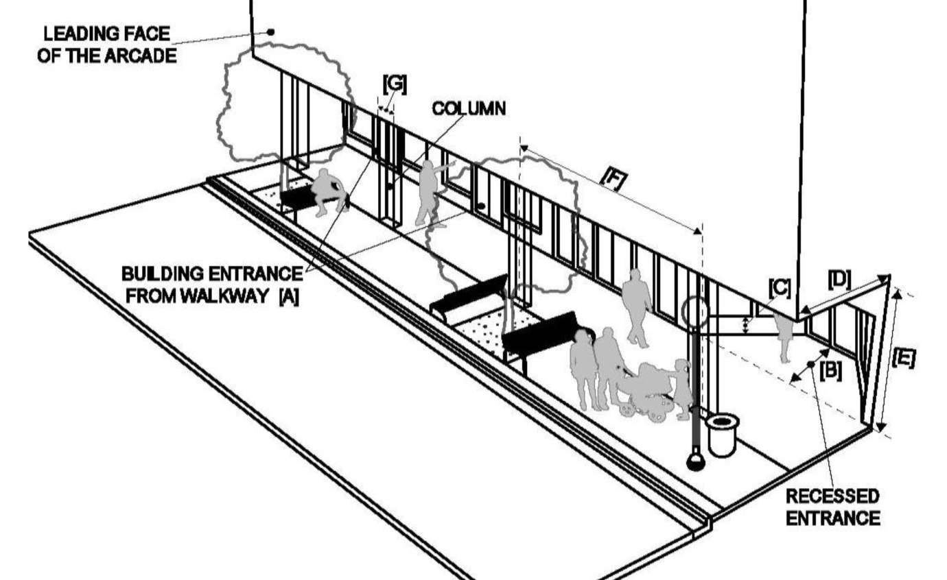 Arcade: A frontage wherein the façade is a colonnade that overlaps the sidewalk, while the façade at sidewalk level remains at the build-to line. This type is conventional for retail/commercial uses. The arcade shall be no less than 8 feet in depth and may overlap the whole width of the sidewalk within 2 feet of the curb, as permitted by law.