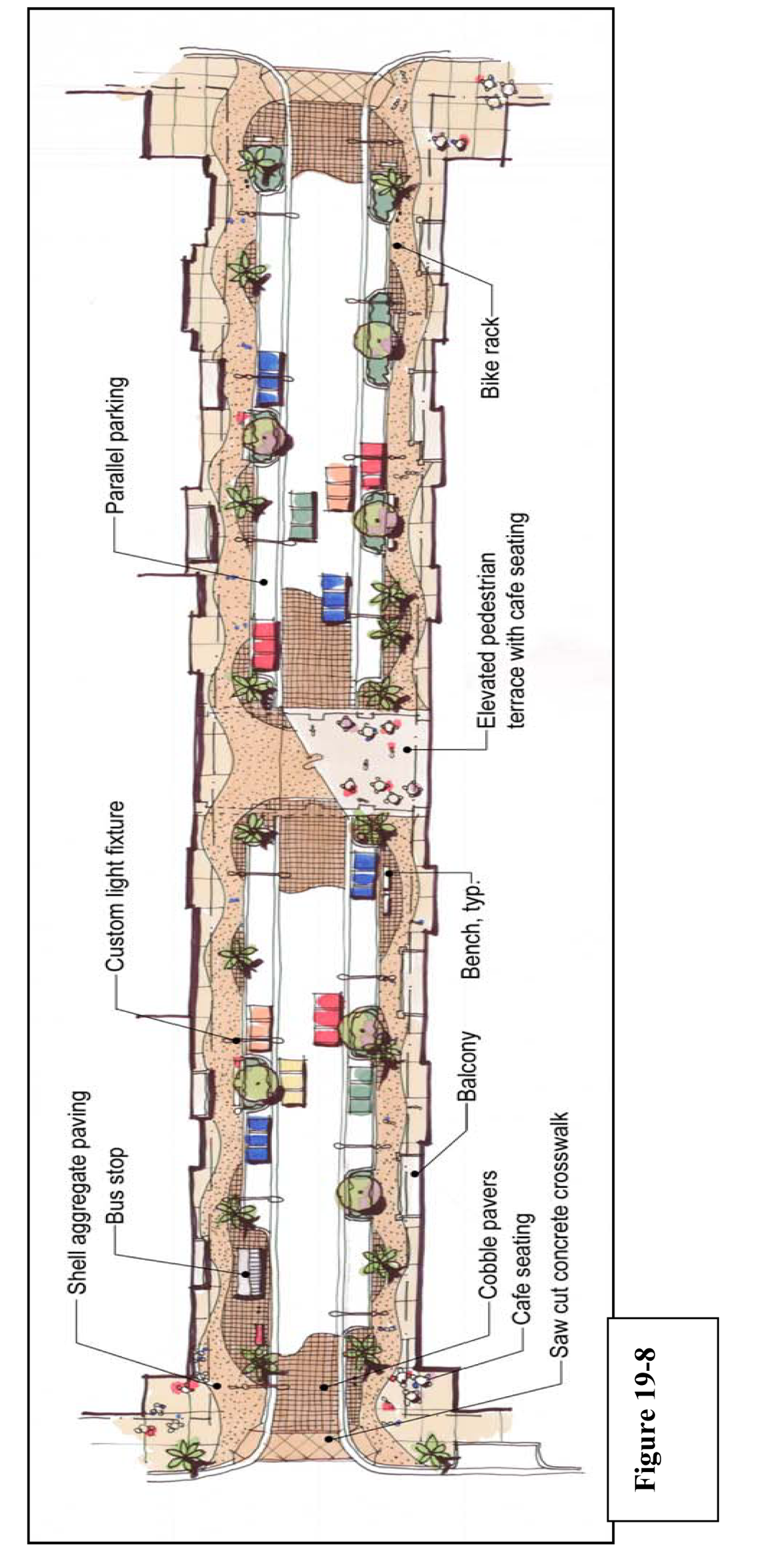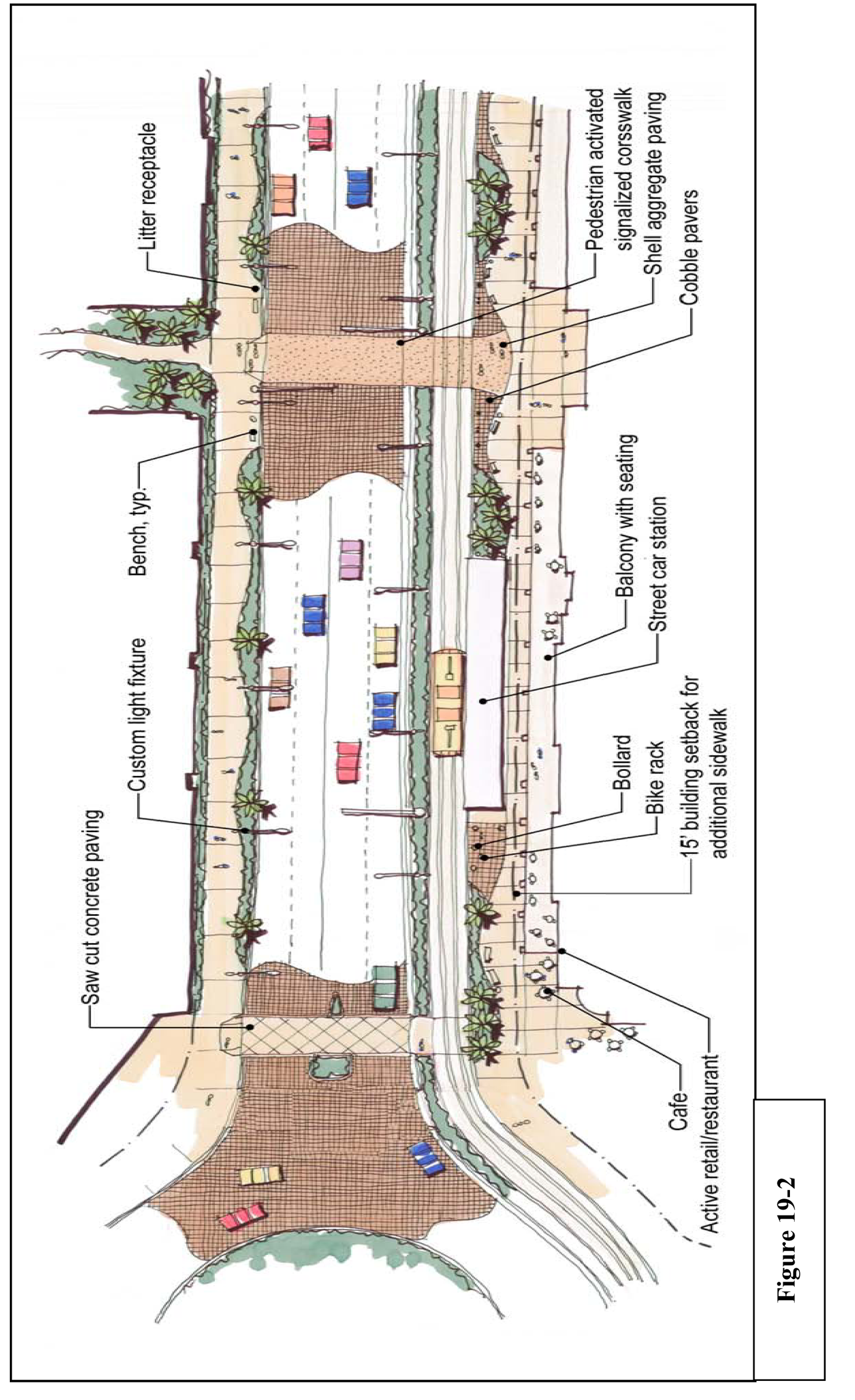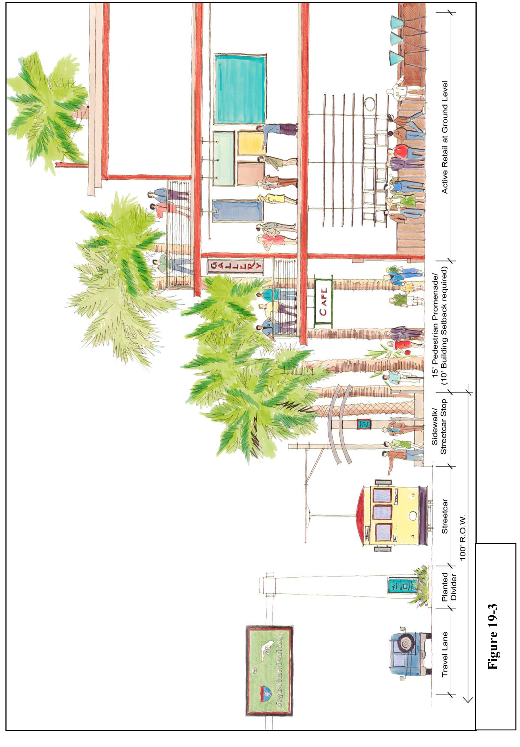 Arcade: A frontage wherein the façade is a colonnade that overlaps the sidewalk, while the façade at sidewalk level remains at the build-to line. This type is conventional for retail/commercial uses. The arcade shall be no less than 8 feet in depth and may overlap the whole width of the sidewalk within 2 feet of the curb, as permitted by law.