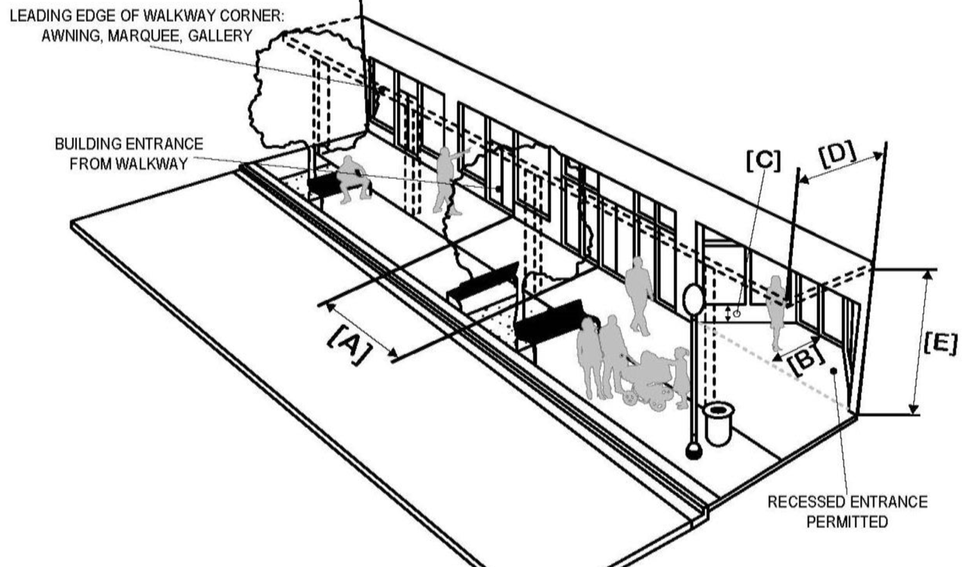 Awning, canopy: A frontage wherein the façade is placed at the build-to line with the building entrance at sidewalk grade. This type is conventional for retail/commercial use. It has a substantial glazing/transparency on the sidewalk/pedestrian level and an awning or canopy that may overlap the sidewalk to the maximum extent possible.