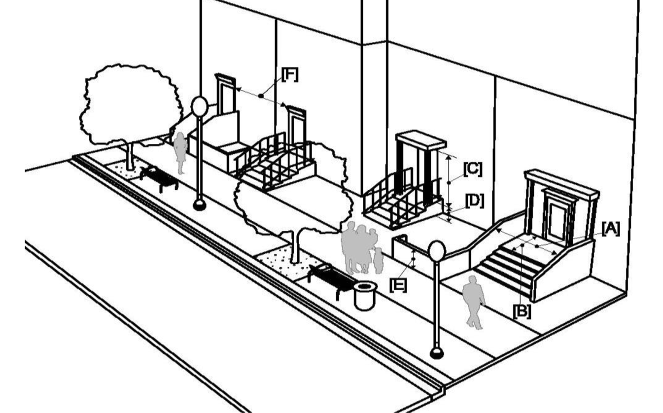 Stoop: The main façade of the building is placed at the build-to line and the elevated stoop engages/interfaces with the sidewalk. If stairs are used to elevate stoop, the stoop may lead directly to the sidewalk or may be side loaded. The minimum width and depth of the stoop shall be 5 feet. This type is appropriate for residential, non-residential and/or mixed use, subject to appropriate ADA requirements.