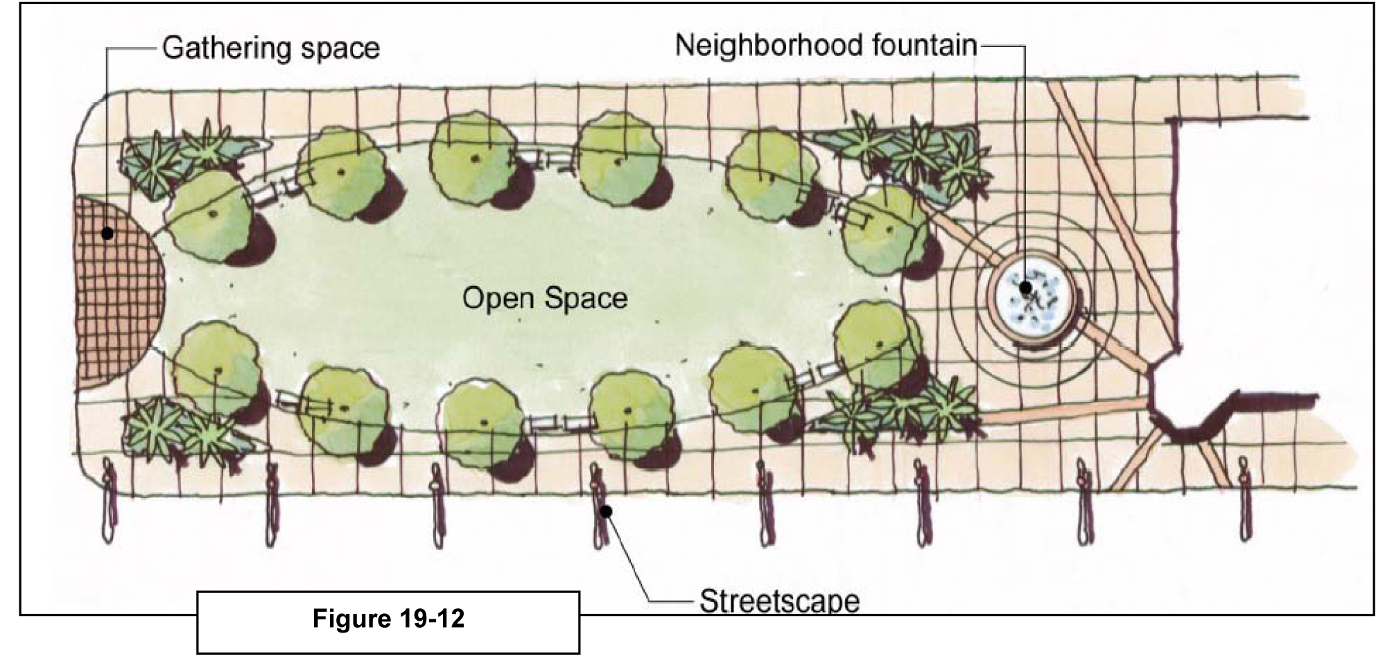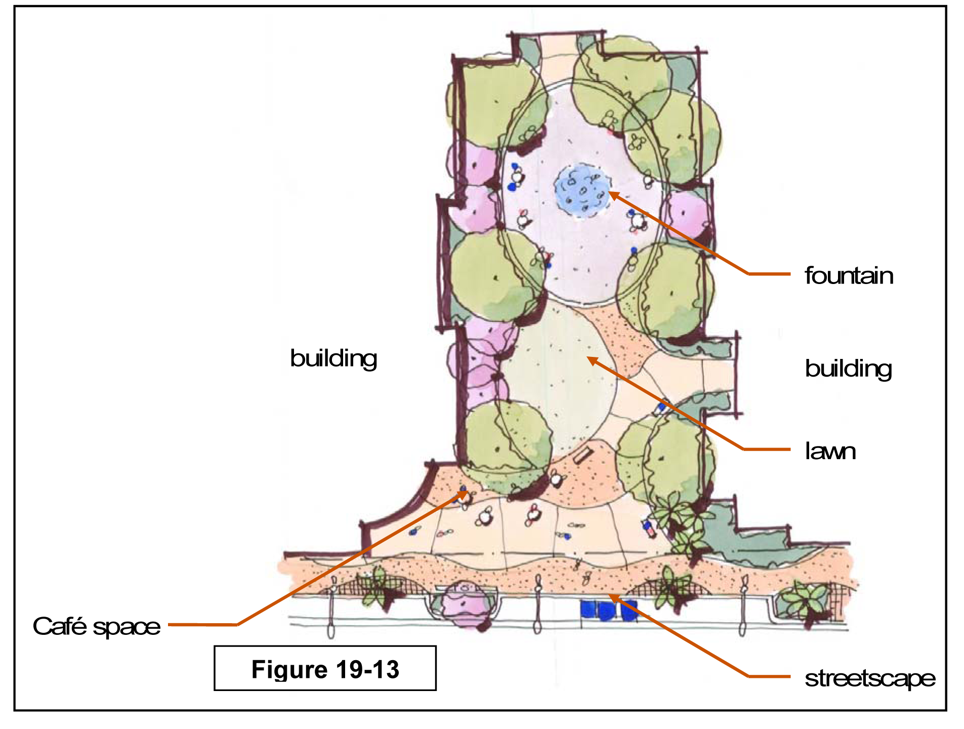 Courtyard: The main façade of the building is placed at the build-to line and a percentage of it is set back (no more than 50%), creating a small court space. The proportions and orientation of these spaces should be carefully considered for solar orientation and user comfort. This frontage type should be used sparingly and should not be repeated within a block. A short wall (no taller than 3' above grade, hedge, or fence shall be placed along the undefined edge.