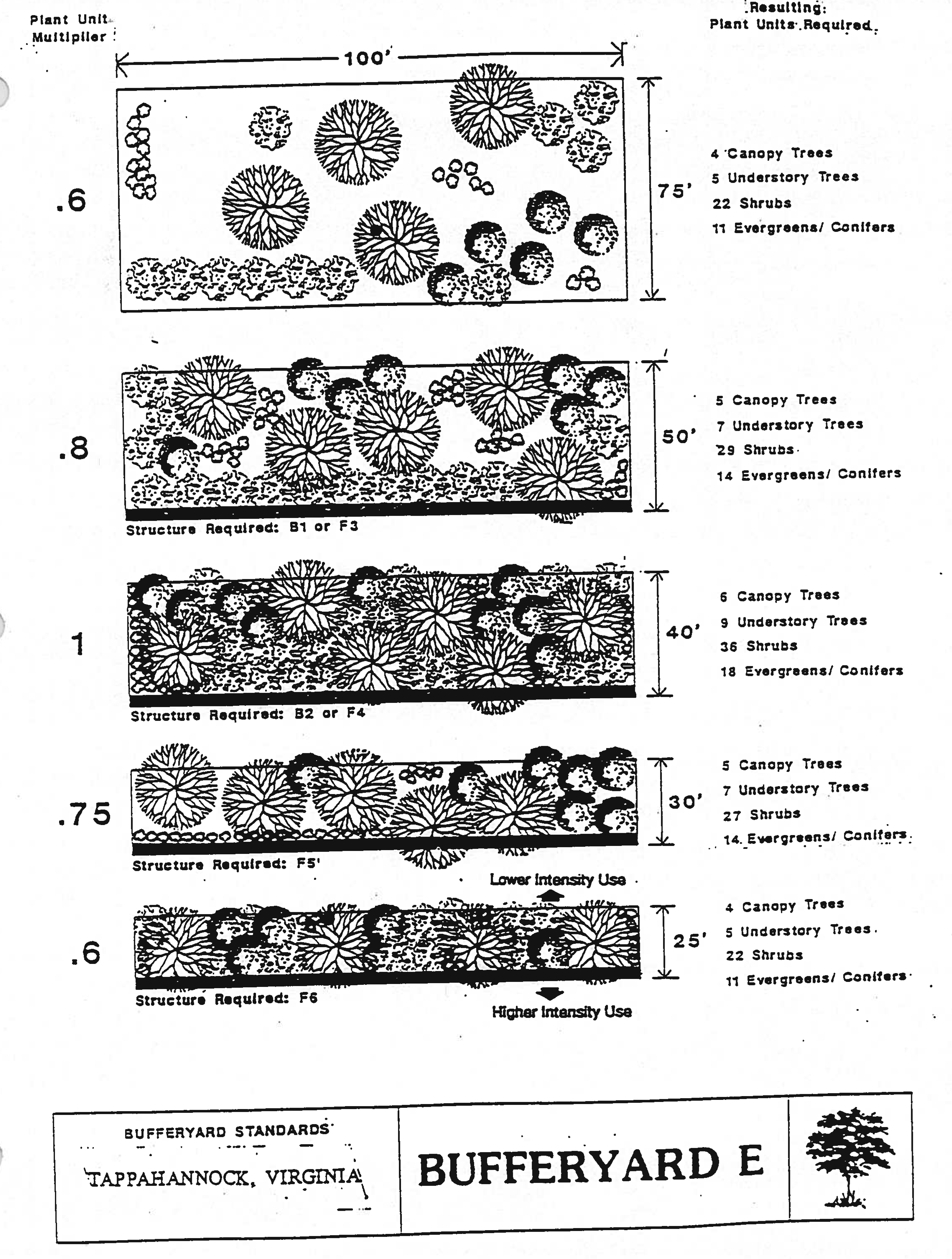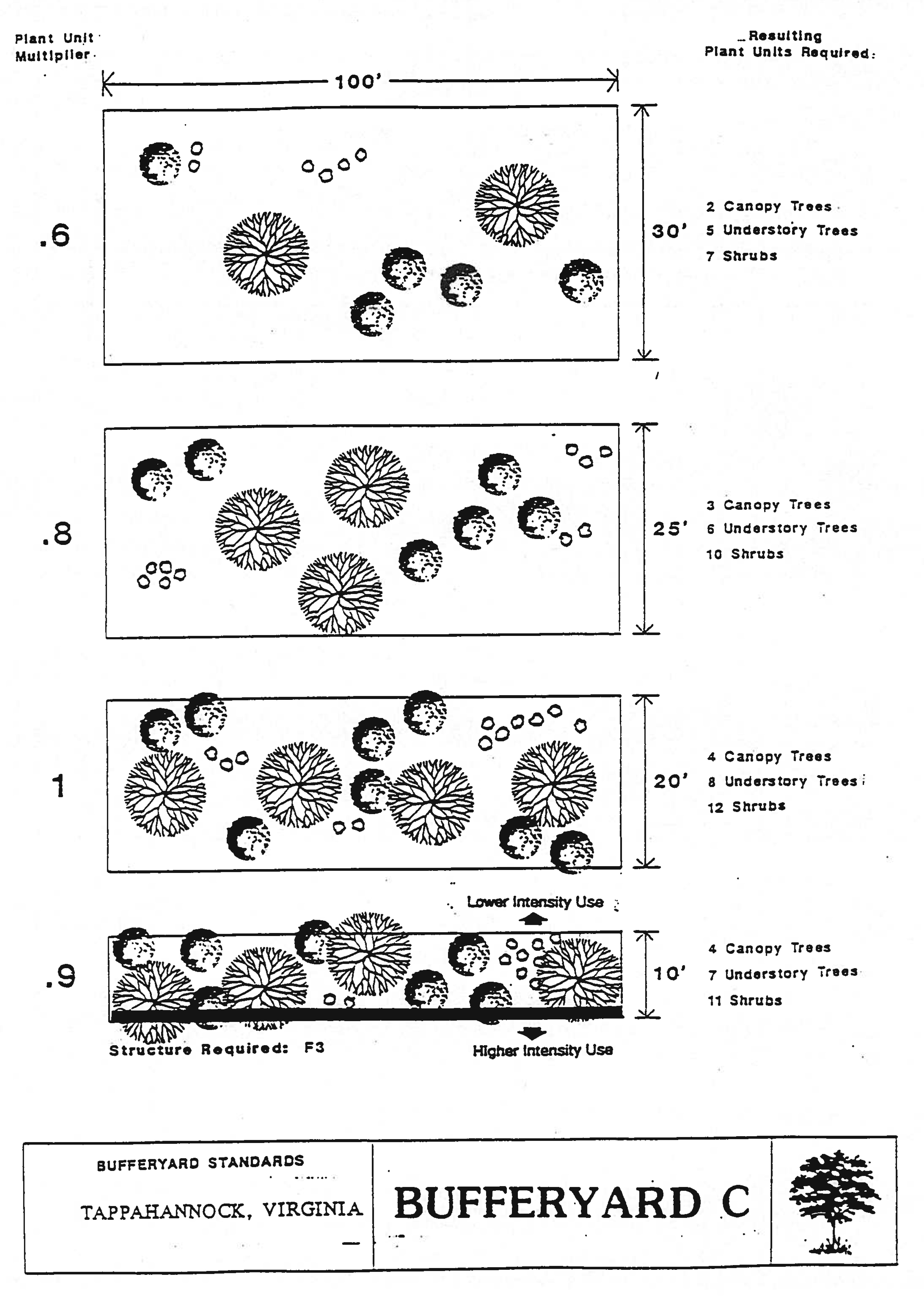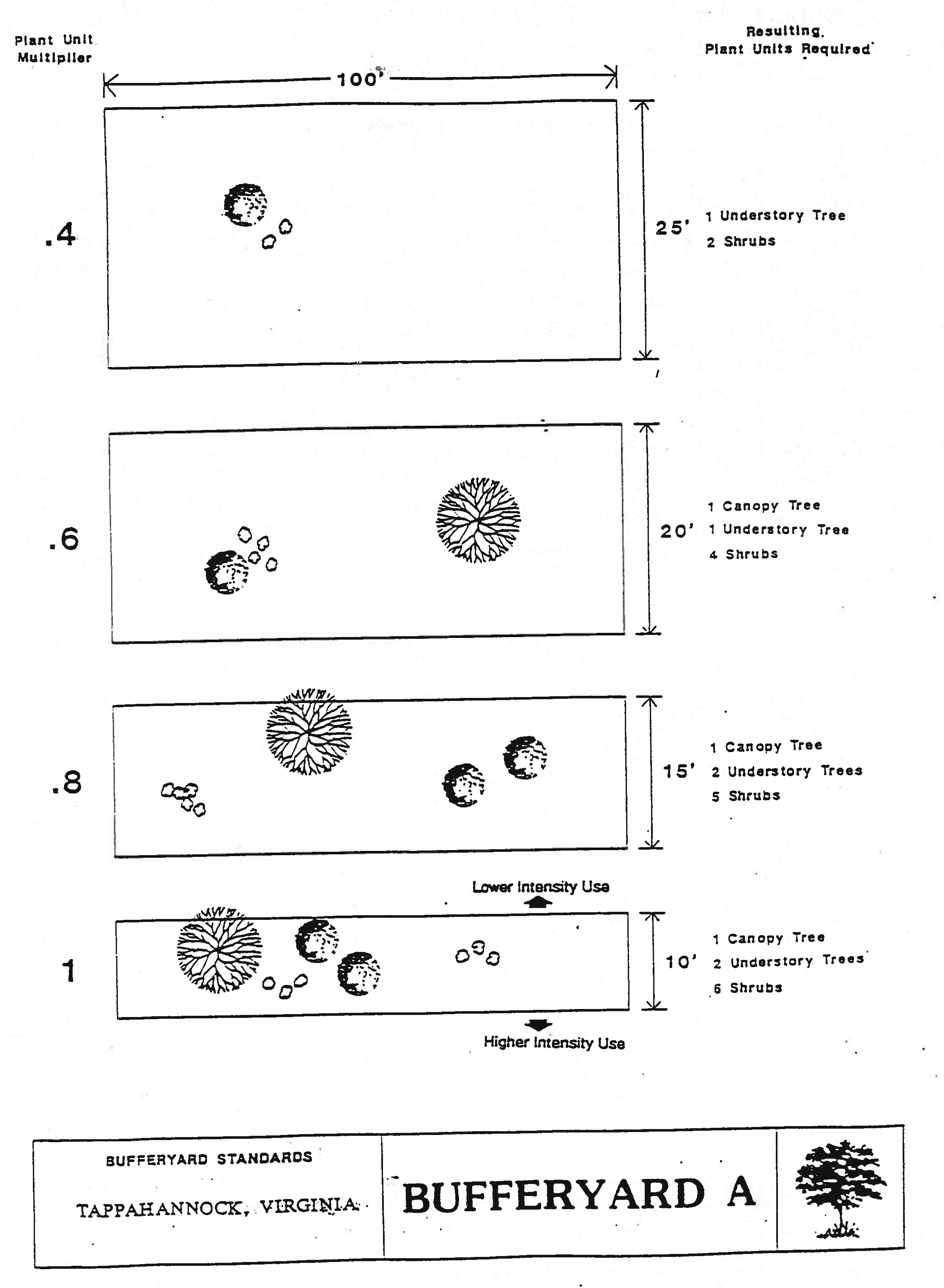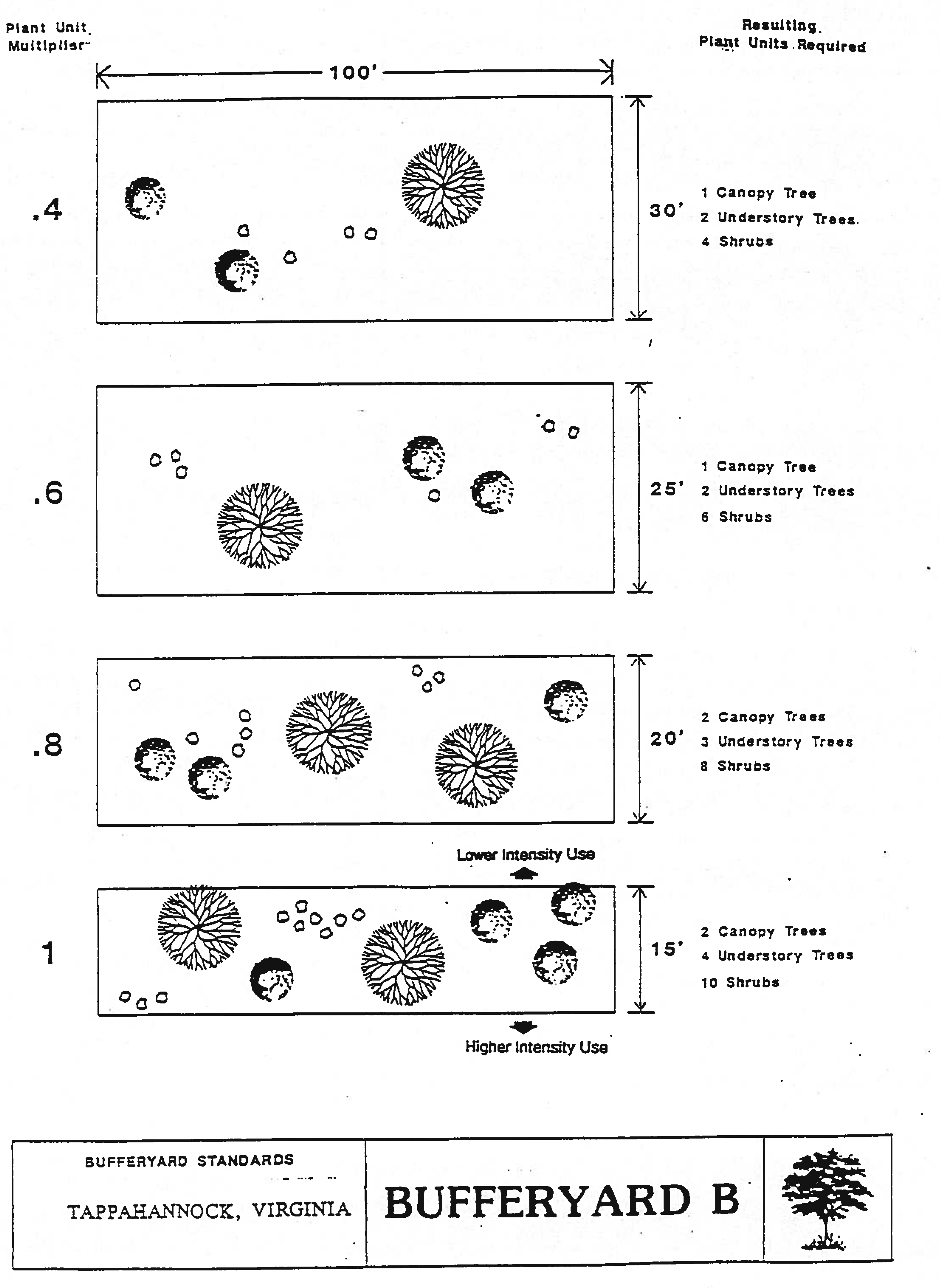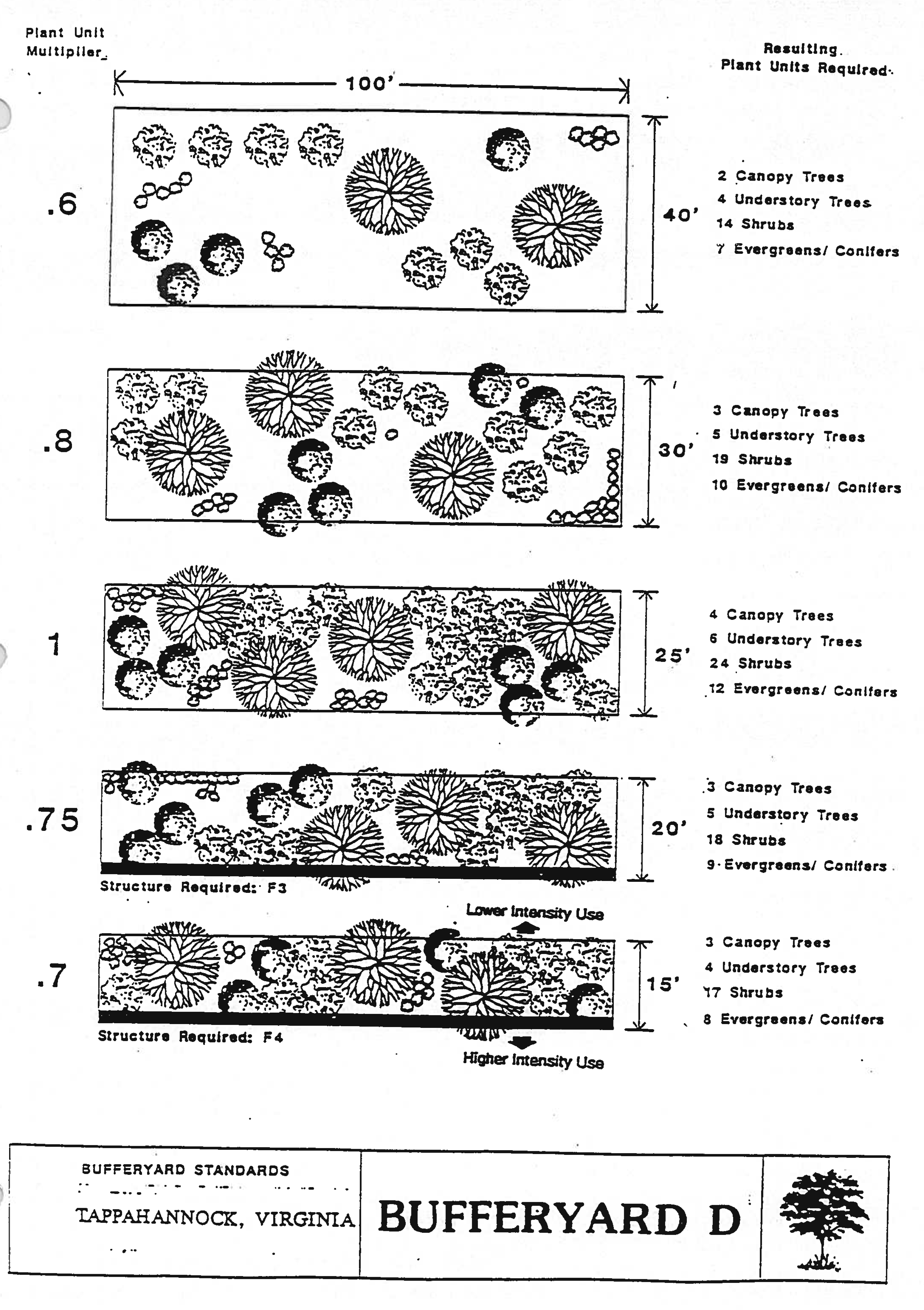 The options within any bufferyard are designed to be equivalent in terms of their effectiveness in eliminating the impact of adjoining uses. Cost equivalence between options was attempted where possible. Generally, the plant materials which are identified as acceptable are determined by the type(s) of soil present on the site. The following illustrations have mathematically rounded the number of plant units required for each option within a given bufferyard. In actual practice, mathematical rounding would be applied to the total amount of plant material required by a bufferyard, not to each 100-foot length of bufferyard. All of the following illustrations are drawn to scale and depict the bufferyard according to the average projected diameter of plant materials at five years after planting.