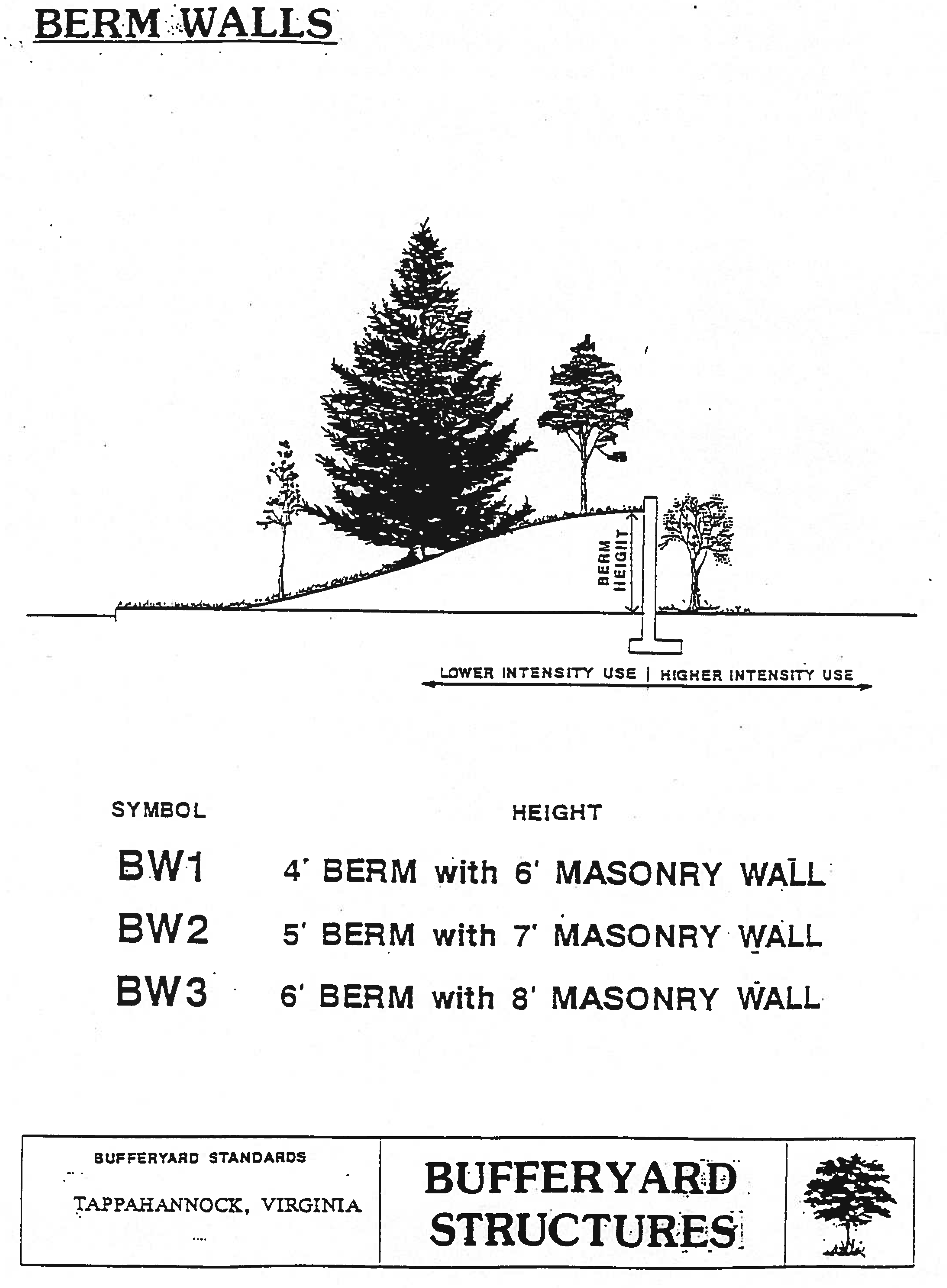 Berms with masonry walls (BW1, BW2, and BW3) required of bufferyard D and E options are intended to buffer more significant nuisances from adjacent uses and, additionally, to break up and absorb noise, which is achieved by the varied heights of plant materials between the masonry wall and the noise source.
