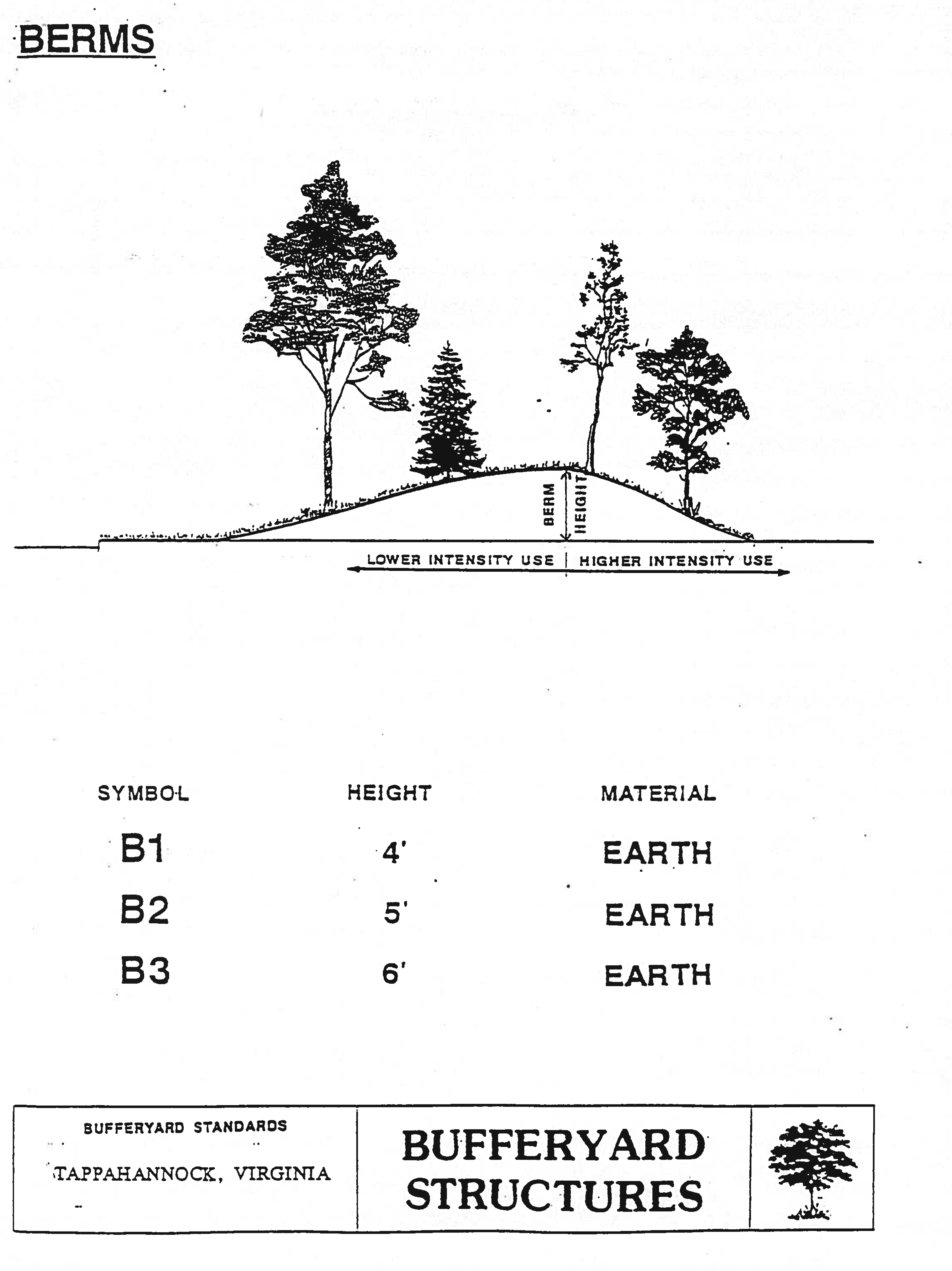 Whenever a wall, fence, or berm is required within a bufferyard, these are shown as "structure required" in the following illustrations, wherein their respective specifications are also shown. All required structures shall be the responsibility of the higher intensity use. Whenever a wall is required in addition to a berm, the wall shall be located between the berm and the higher intensity use, in order to provide maximum sound absorption.
