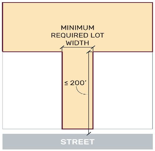 That portion of a flag lot between the street onto which it has access and the point where a lot dimension parallel to the street first equals or exceeds the minimum lot width set forth in Chapter 2 of this Ordinance may be no longer than 200 feet.