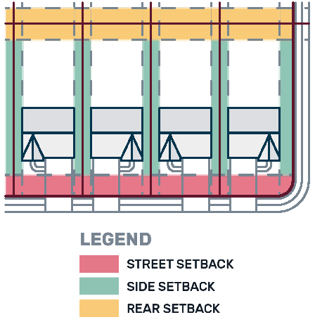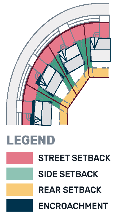 Calculating Side and Rear Setbacks: The minimum setback is the space defined by measuring perpendicularly from and along the entire boundary of the lot to the building as shown in the diagram to the left.