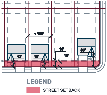 Infill Lot Standards: The street setback requirements of this Ordinance for residential dwellings shall not apply to any lot where the average setback of existing buildings (located wholly or partially within one hundred feet on either side of the proposed dwelling and on the same side of the street in the same block and zoning district) is less than the minimum required street setback. In such case, the street setback on such lots may be less than required in the subject zoning district, but not less than the average of the existing setbacks on the aforementioned lots or a distance of fifteen feet from the right-of-way, whichever is greater.