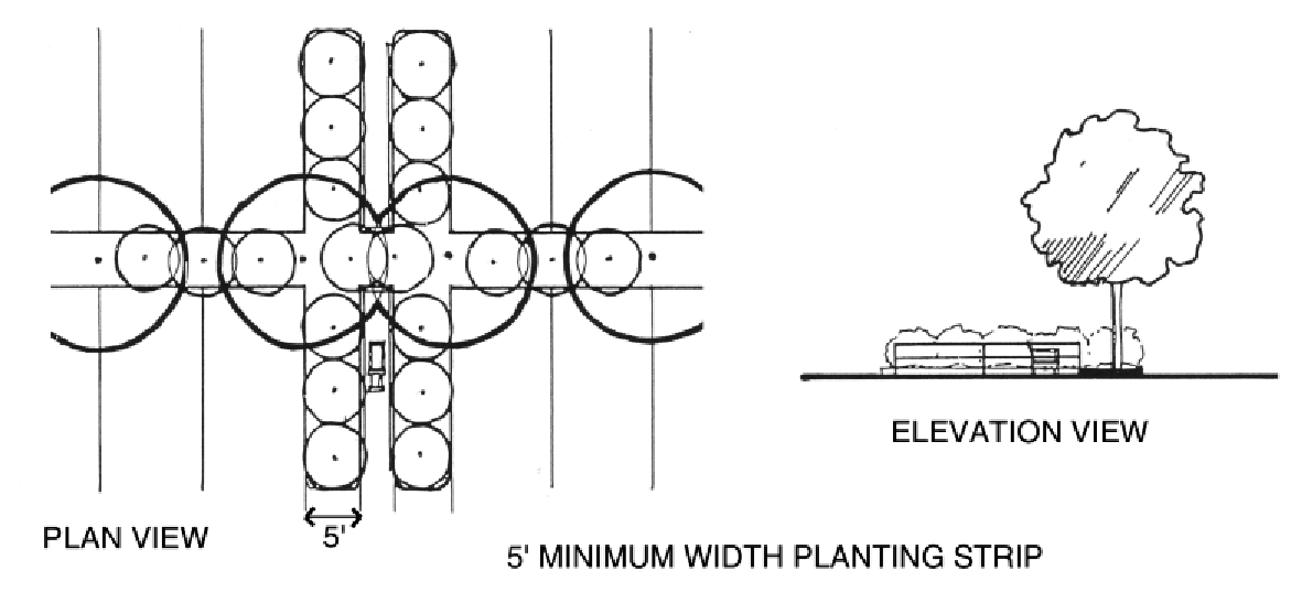A planting strip of twelve (12) feet in width and containing shade trees shall be used to screen parking lots from adjacent residential properties or as otherwise required by section 4.08 and section 4.09.