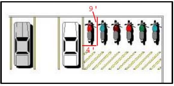 Motorcycle parking may be provided in lieu of one (1) automobile space or two percent (2%) of all automobile spaces, whichever is greater, for building sites containing a minimum of twenty (20) parking spaces. The motorcycle parking stall must be a minimum of four feet (4') wide by nine feet (9') deep and be clearly identified by signs or markings as reserved for motorcycles.