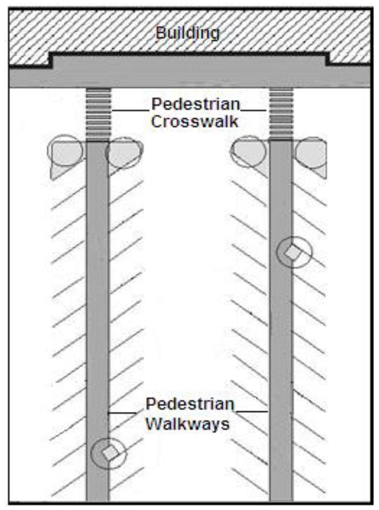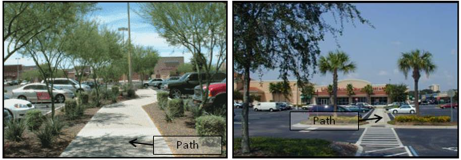 To provide safe and convenient pedestrian paths from the street sidewalk throughout parking lots to building entries in order to foster pleasant walking experiences; and