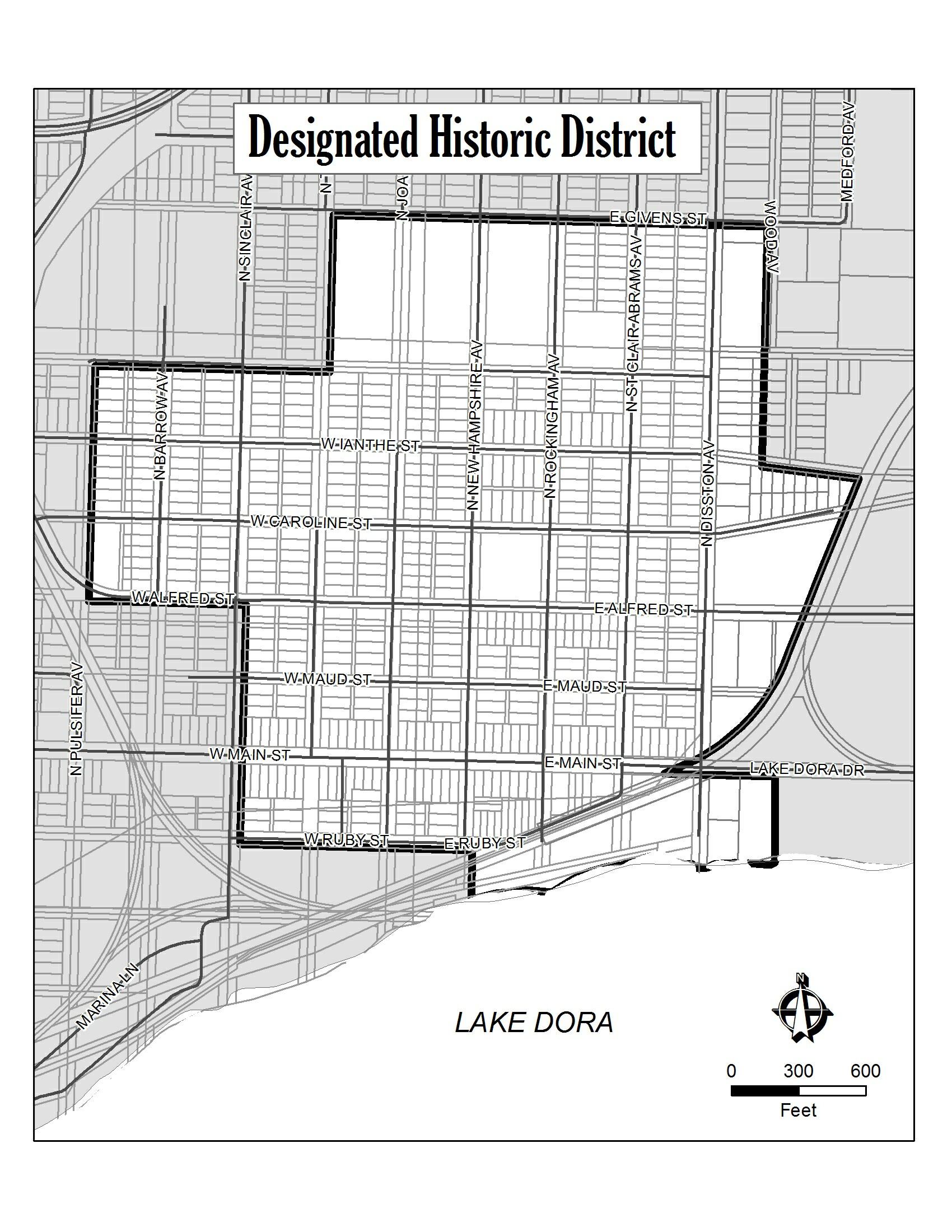 The historic district is defined as starting at a point of intersection at the southern boundary right-of-way on Texas Avenue and the eastern boundary of Givens Street, proceeding easterly along the southern boundary of the right- of-way of Givens Street to the point of intersection with the western boundary of the right-of-way of Wood Avenue, proceeding southerly along the western boundary of the right-of-way of Wood Avenue to the point of intersection with the southern boundary of the right-of-way of Ianthe Street, proceeding easterly along the southern boundary of the right-of-way of Ianthe Street to the point of intersection with railroad right-of-way, proceeding southeasterly along the western boundary of the railroad right-of-way to a point of intersection with the Lake Dora Drive right-of-way, proceeding southerly to a point of intersection with the southern boundary of the Lake Dora Drive right-of-way, proceeding easterly along the southern boundary of the Lake Dora Drive approximately 300 feet (point of intersection with the eastern boundary of Lot 15, less eastern 15 feet, Block 27 as recorded in OR Book 1272, Page 1238), proceeding southerly along the eastern boundary of Lot 15, less eastern 15 feet, Block 27, approximately 334.8 feet to the northern shore of Lake Dora, proceeding easterly along the shoreline to the eastern boundary of the right-of-way of New Hampshire Avenue, proceeding northerly along the eastern boundary of New Hampshire Avenue to a point of intersection with the southern boundary of the right-of-way of Ruby Street, proceeding westerly along the southern boundary of Ruby Street to a point of intersection of the right-of-way of Sinclair Avenue, proceeding northerly along the eastern boundary of the right-of-way of Sinclair Avenue to a point of intersection with the right-of-way of Alfred Street, proceeding westerly along the southern boundary of the right-of-way of Alfred Street to a point of intersection with the right of way of Pulsifer Avenue, proceeding northerly along the eastern boundary of the right-of-way of Pulsifer Avenue to the point of intersection of Esther Street, proceeding easterly along southern boundary of the right-of-way of Esther Street to the point of intersection with the eastern boundary of the right-of-way of Texas Avenue, proceeding northerly along the eastern boundary of the right-of-way of Texas Avenue to the point of beginning.