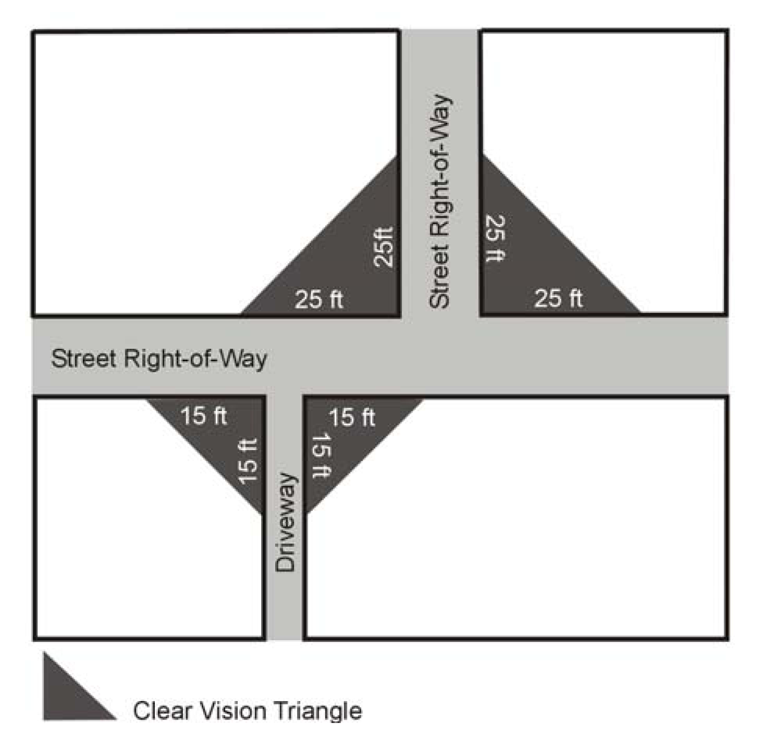 Fences, walls, structures, or plantings located in the clear vision triangle, as depicted below, shall not be permitted to exceed a height of 24 inches above the lowest point of the intersecting streets. The unobstructed triangular area is described as follows: