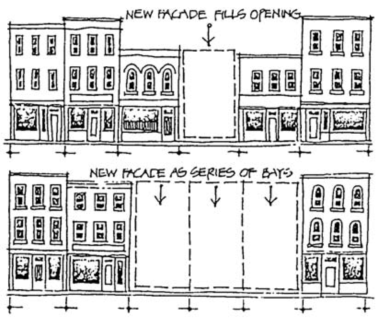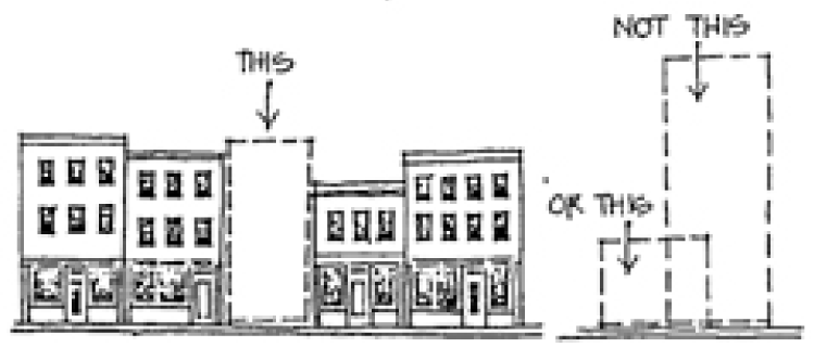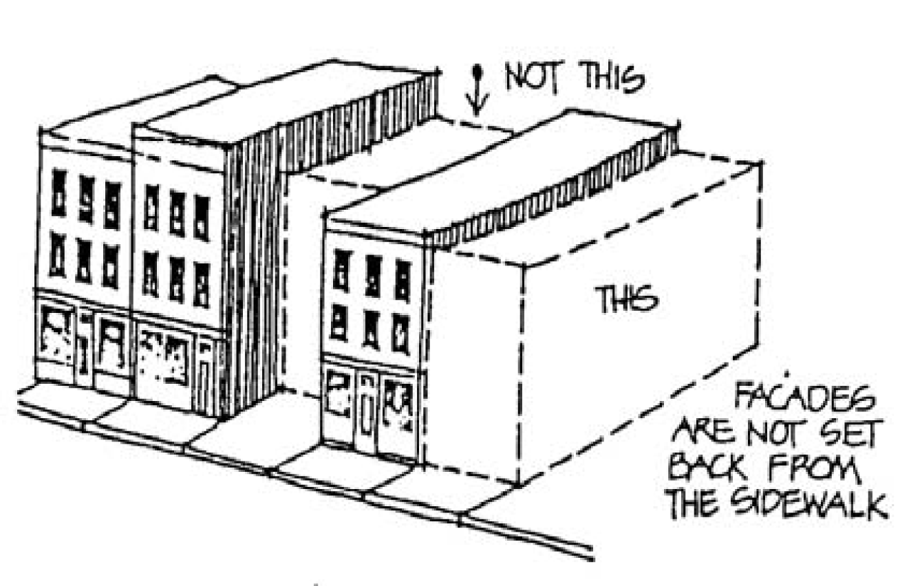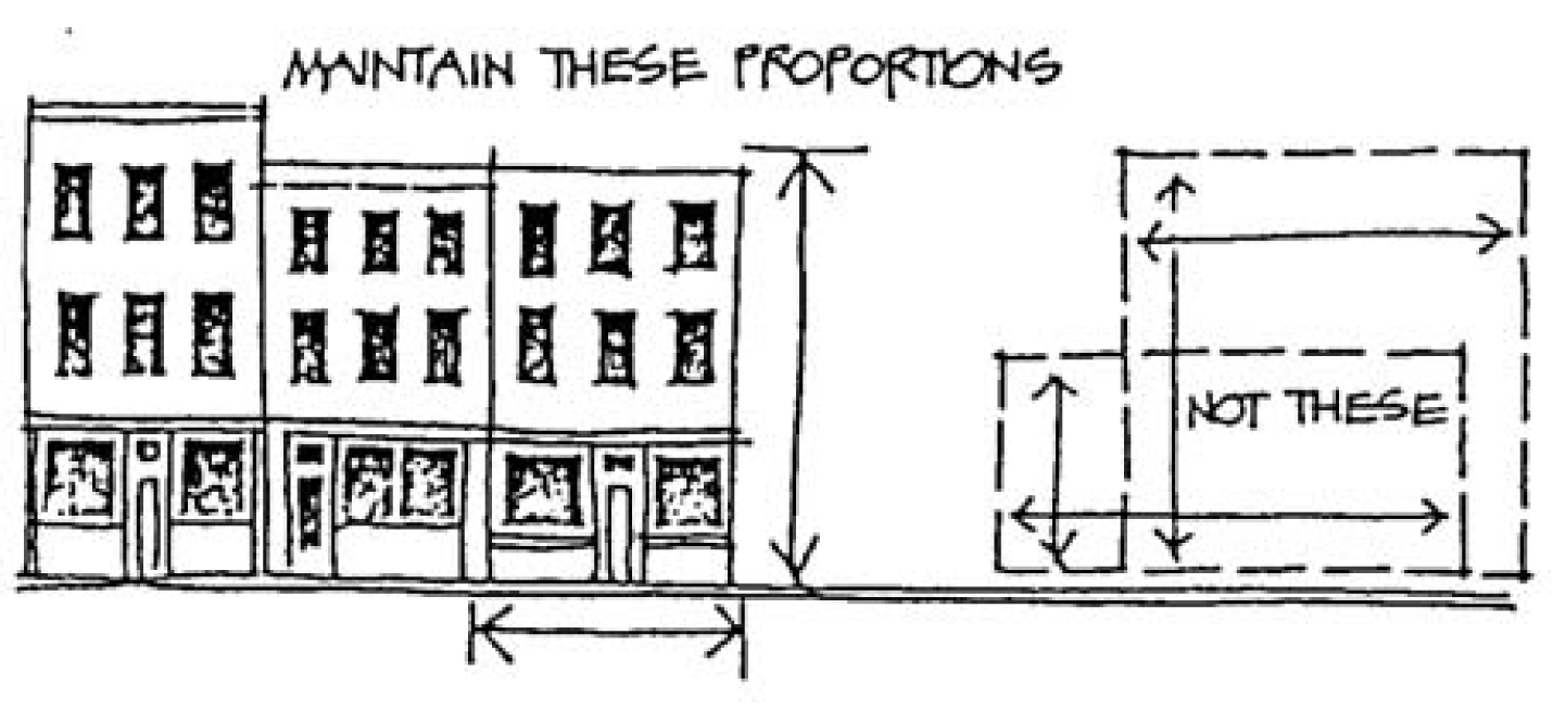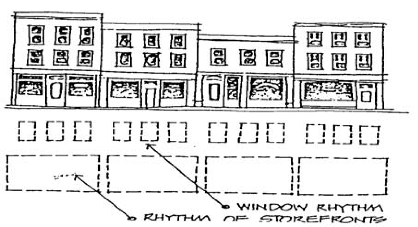 Building setback and rooflines shall generally match the established pattern of buildings on site and adjacent properties to maintain the existing street wall patterns and design as depicted in table 16.01.a. The rhythm established through the existing architectural elements shall also be maintained. The elements shall include, but be not limited to, frequency and spacing of windows, doorways, and storefronts.