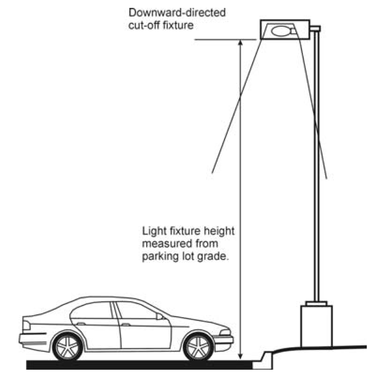 Fixture height. Light fixtures shall have a maximum height of 20 feet where adjacent to any residential district. Light fixtures shall have a maximum height of 25 feet where adjacent to nonresidential districts. Heights is measured from the parking lot grade.